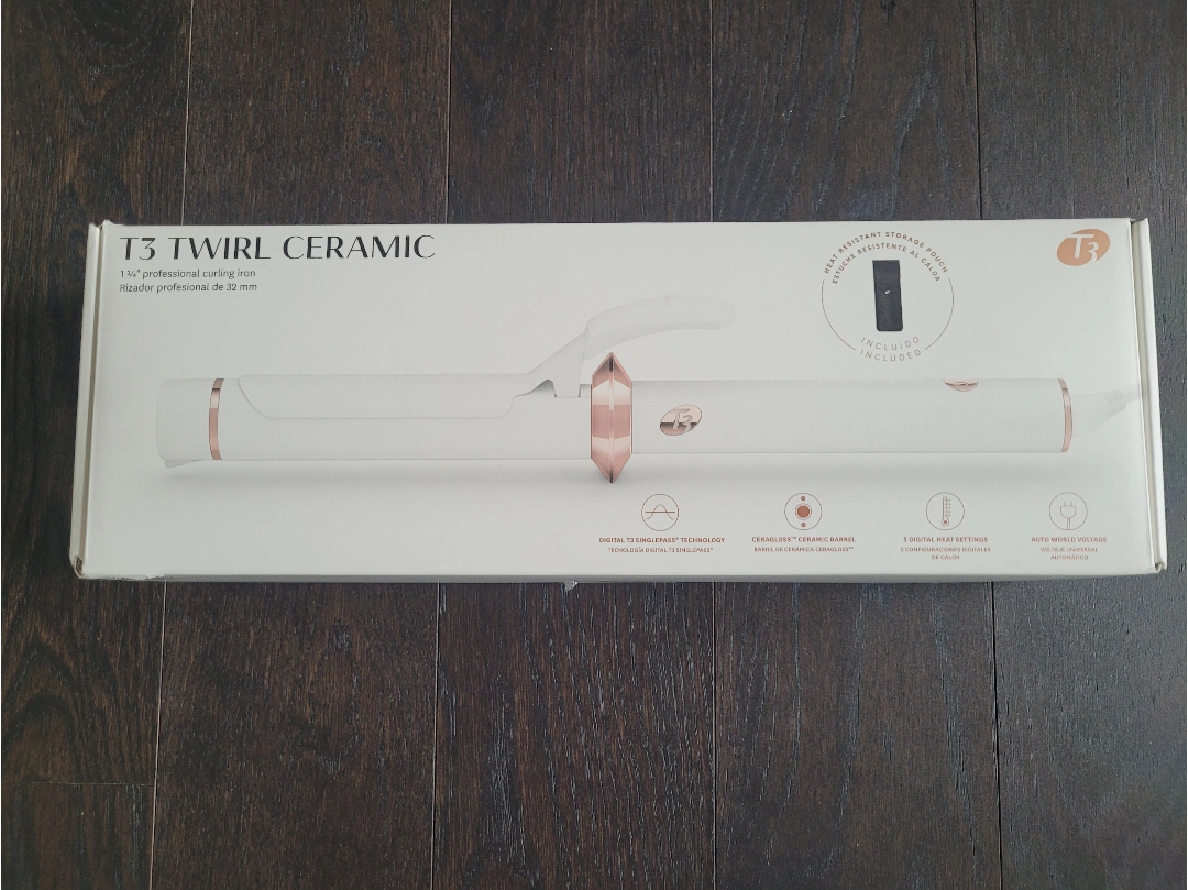 189Like new (used only once) T3 Twirl Ceramic 1 1/4 inch professional curling iron. Includes heat resistant storage pouch. White and rose gold.