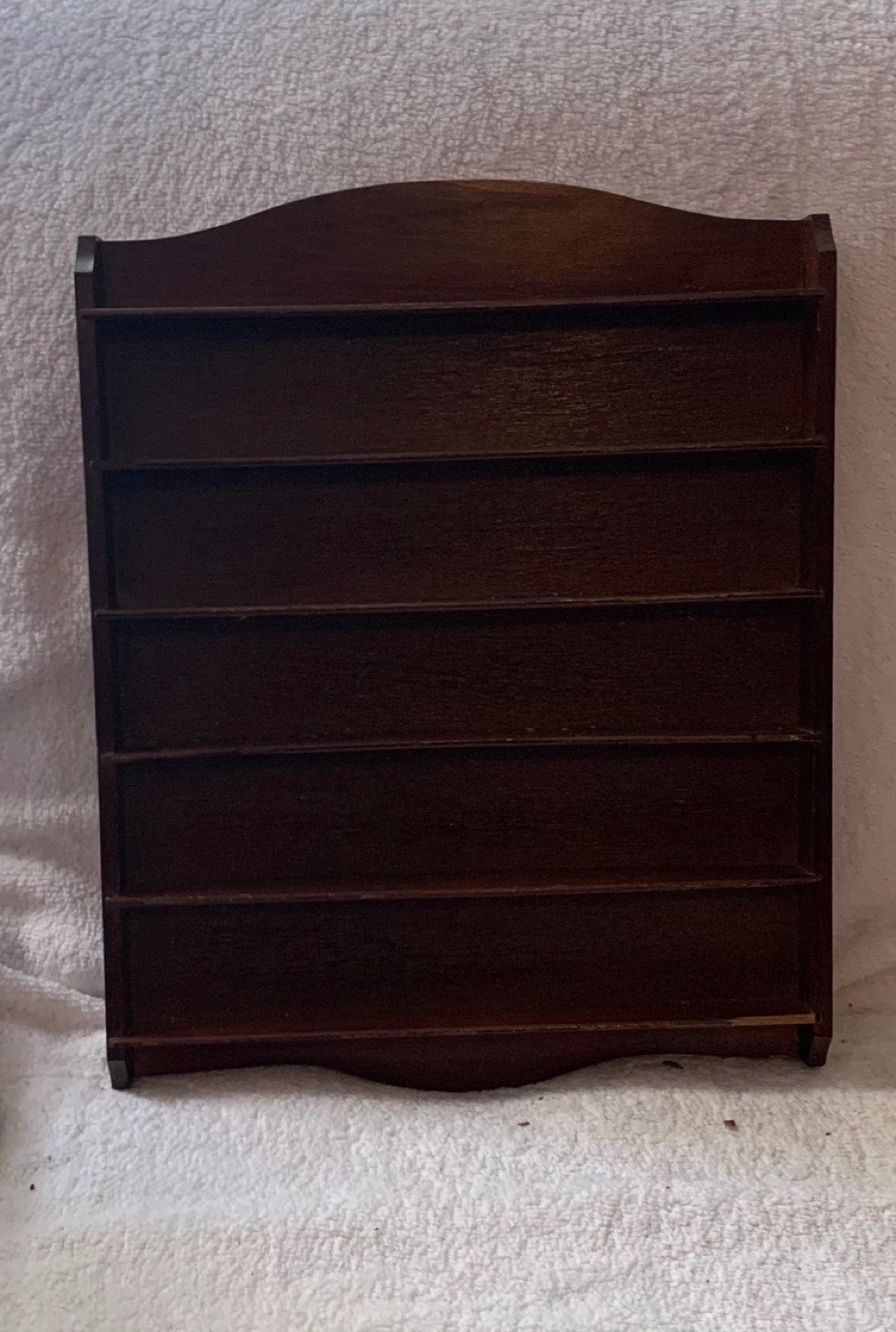 Dark brown wooden shelf with five shelves/compartments. Perfect for displaying collectibles or small items. Wall mountable. Shows some minor wear.