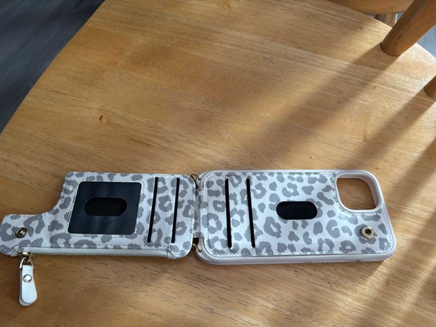 Cute phone case with a detachable wallet. Grey leopard print design. Zipper closure. Compatible with iPhone 13 Pro Max. Good condition. Good for IPhone 15!! Smoke free home! Pick up and cash only!!