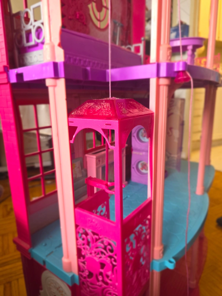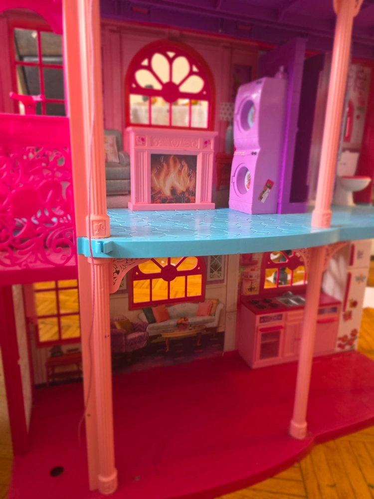 It's a Barbie Dreamhouse with lots of rooms – kitchen, bathroom, bedroom, living room, the works! It even has a working elevator. Pink and purple, but a couple of the little pillars are a bit damaged.