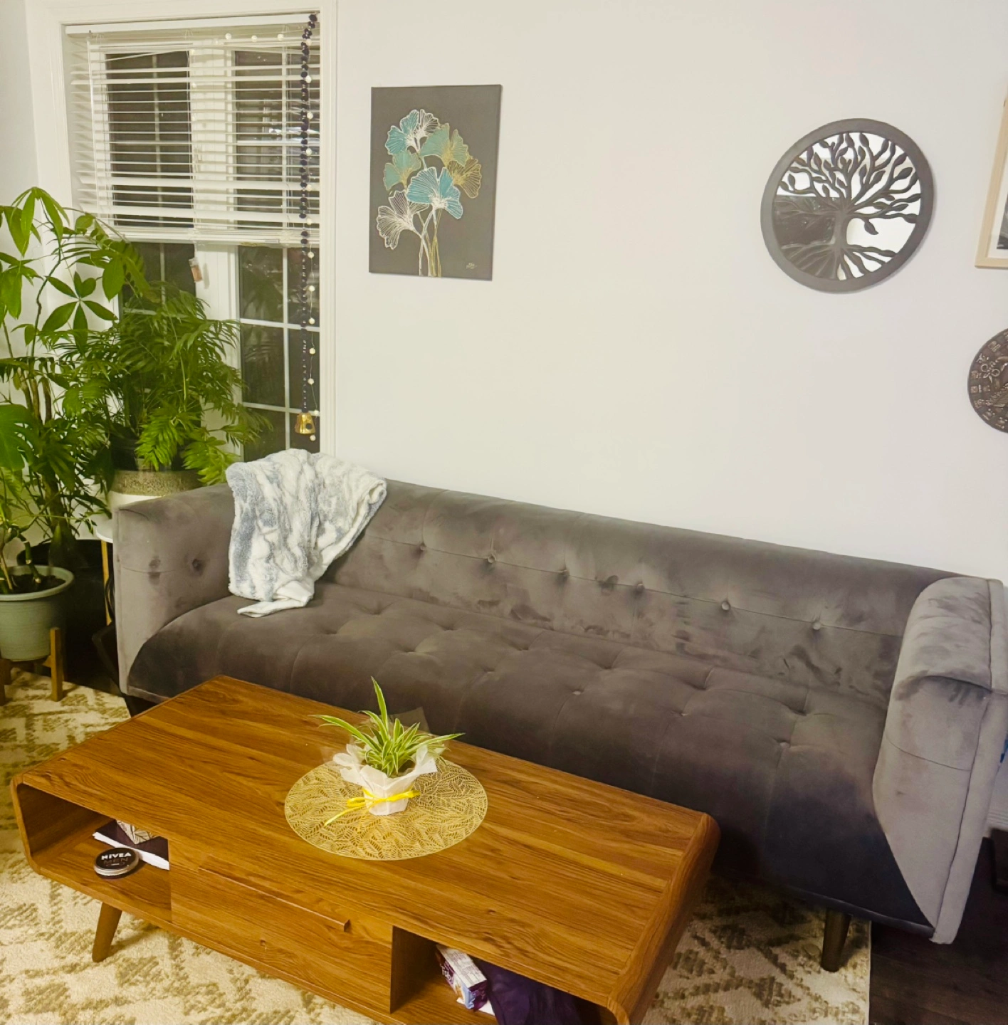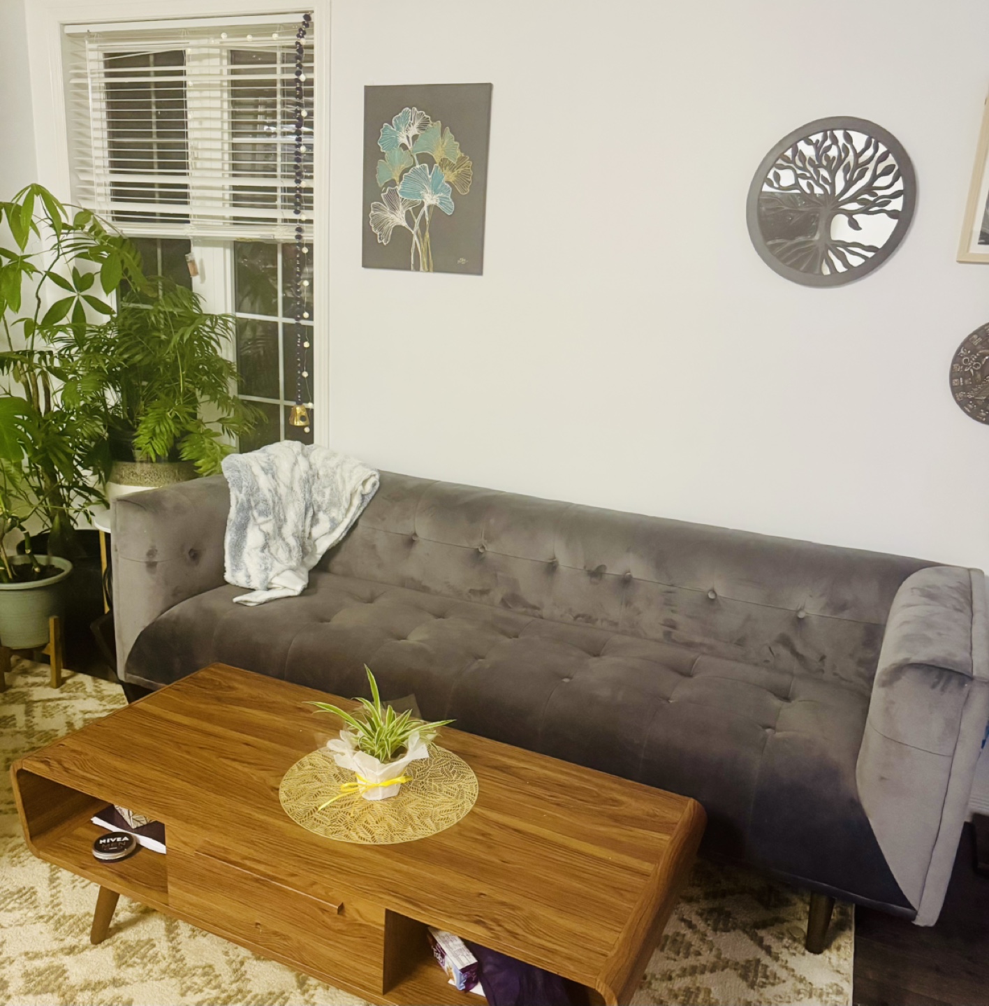 Cozy & Comfortable 3 seater grey velvet couch, perfect for small spaces. Gives a modern minimalistic vibe to your space.