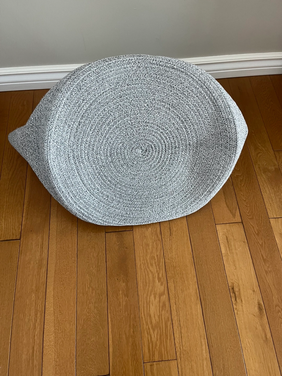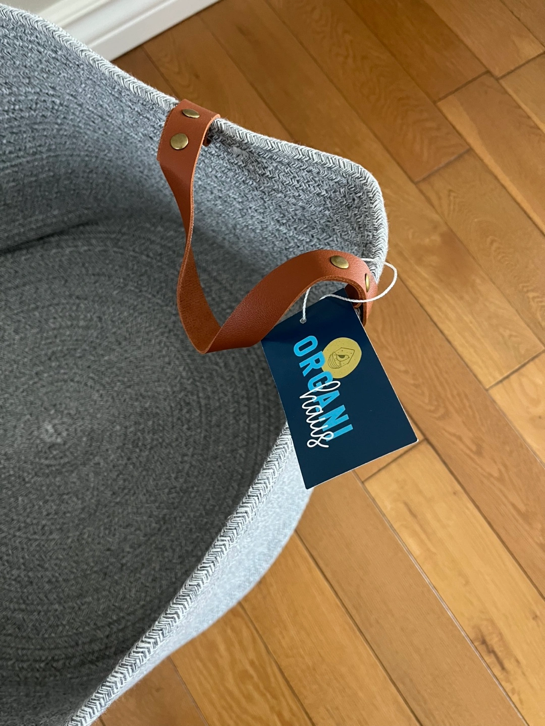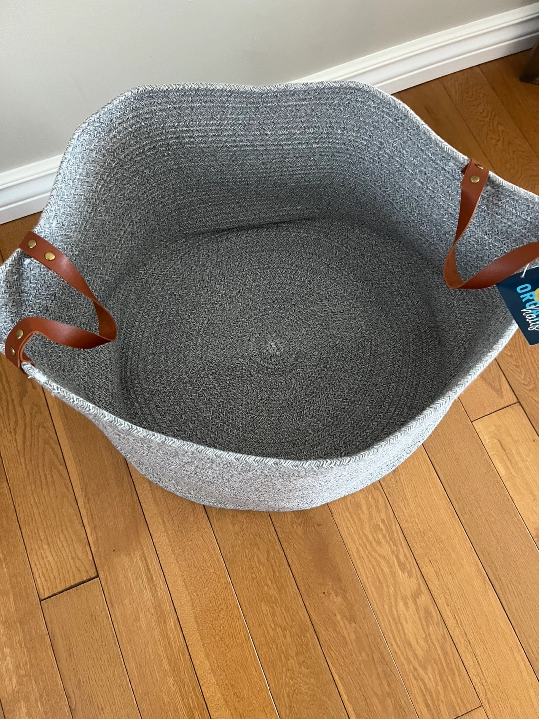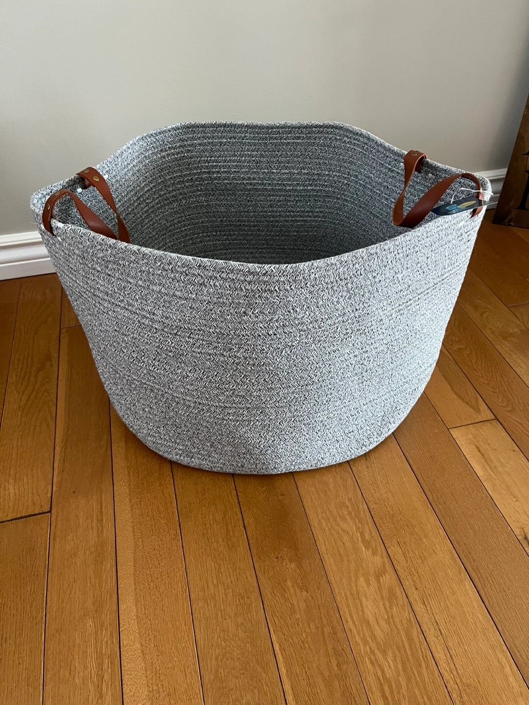 Large grey storage basket. Made of thick rope. Features two brown leather handles. Perfect for blankets, toys, or other storage needs. Brand New