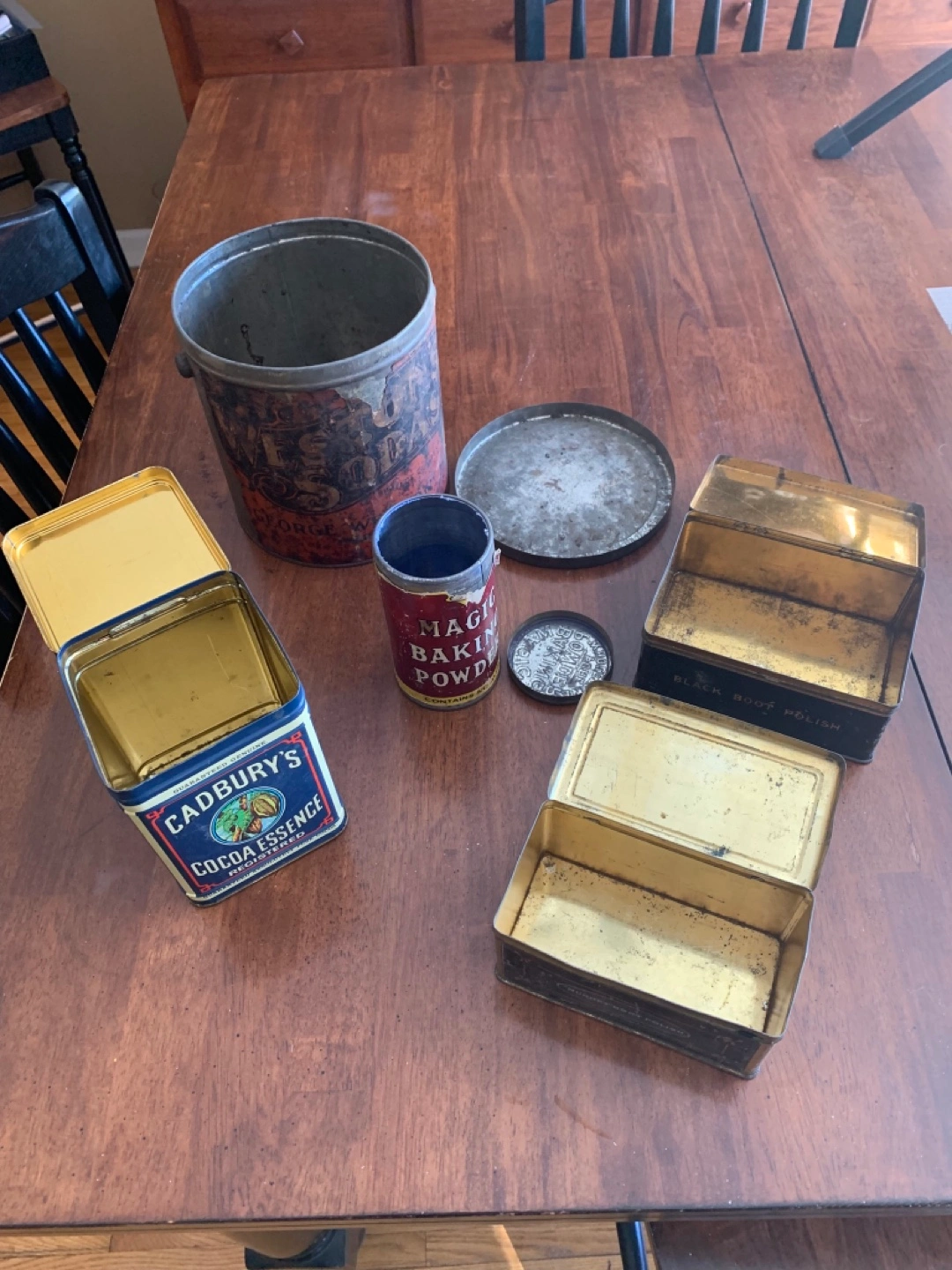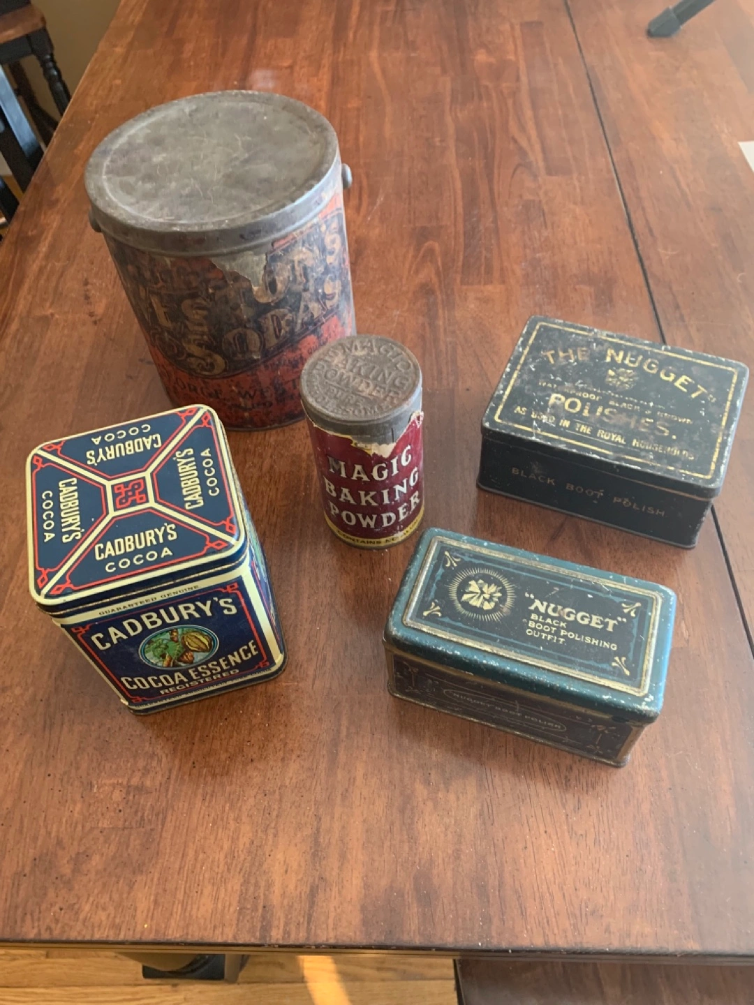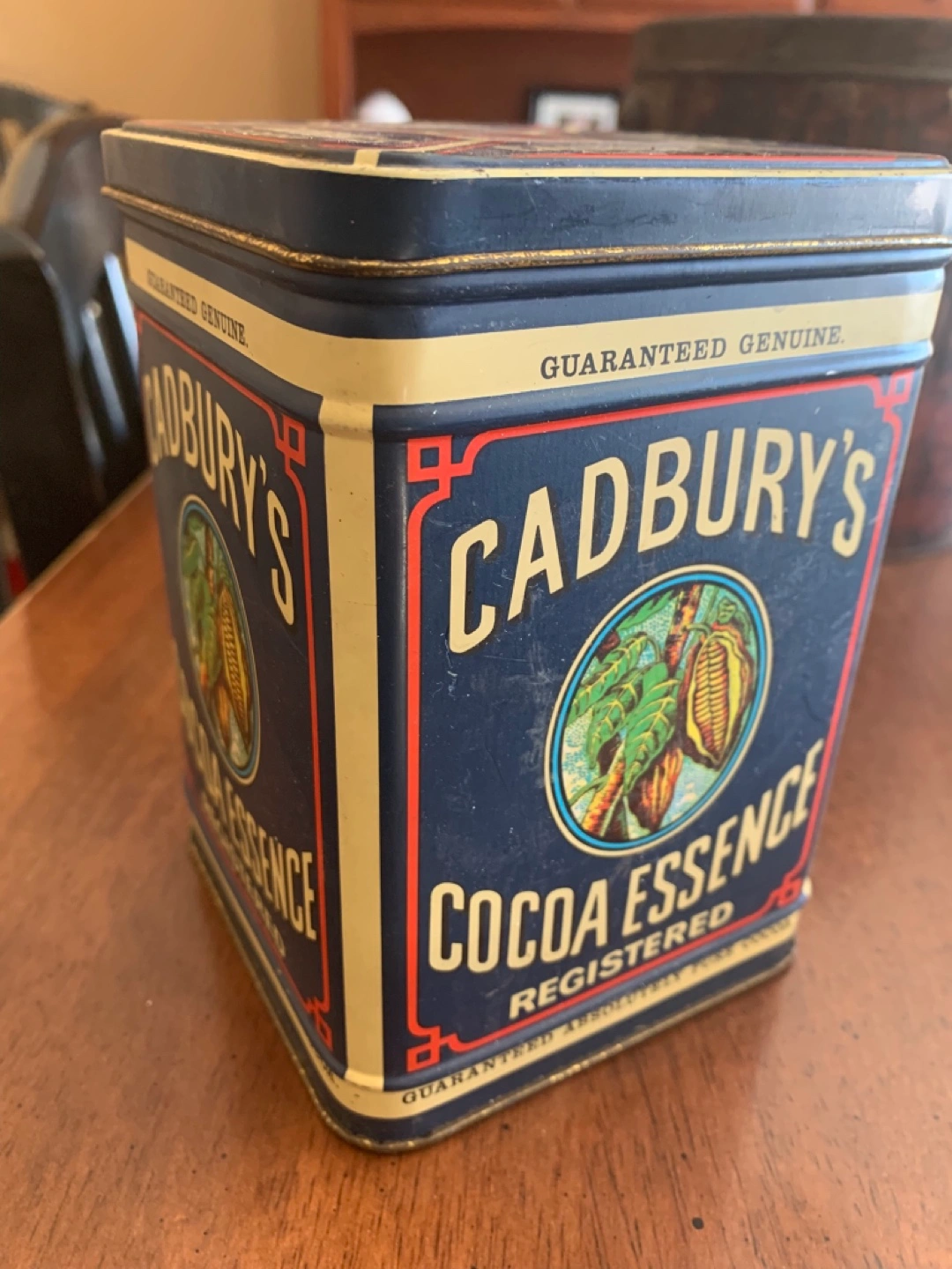 The taller square tin is a replica dated 1977. It has a hinged lid and is painted with the following, “CADBURY’S COCOA ESSENCE REGISTERED GUARANTEED GENUINE. GUARANTEED ABSOLUTELY PURE COCOA. (C) CADBURY 1977”