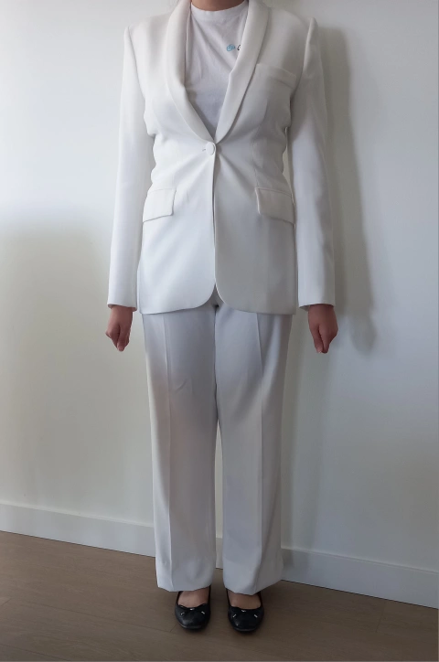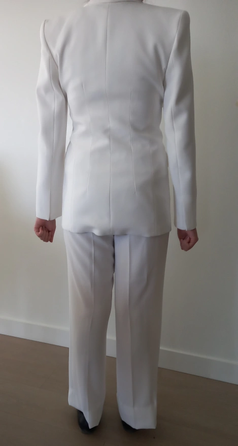 Zara elegant white suit, classic style. Blazer is XS and trousers are M, although I would argue that the blazer can also fit for medium.