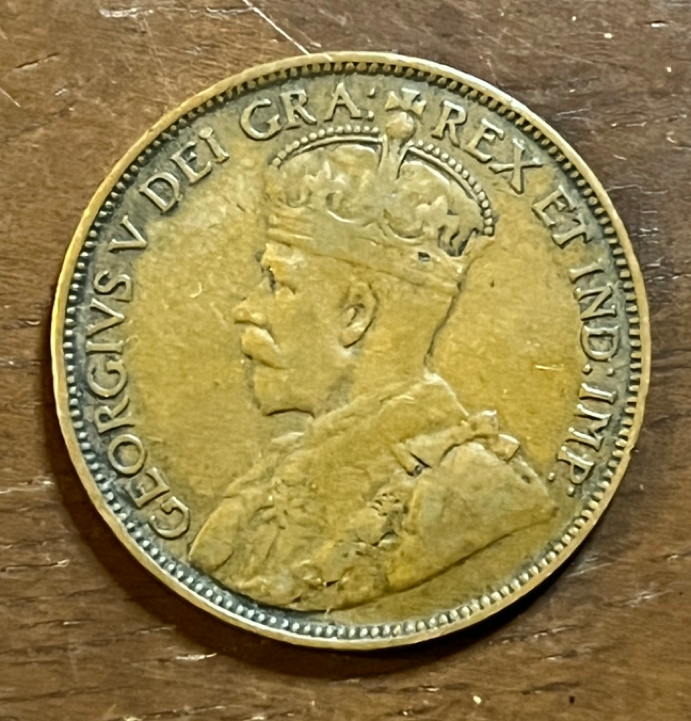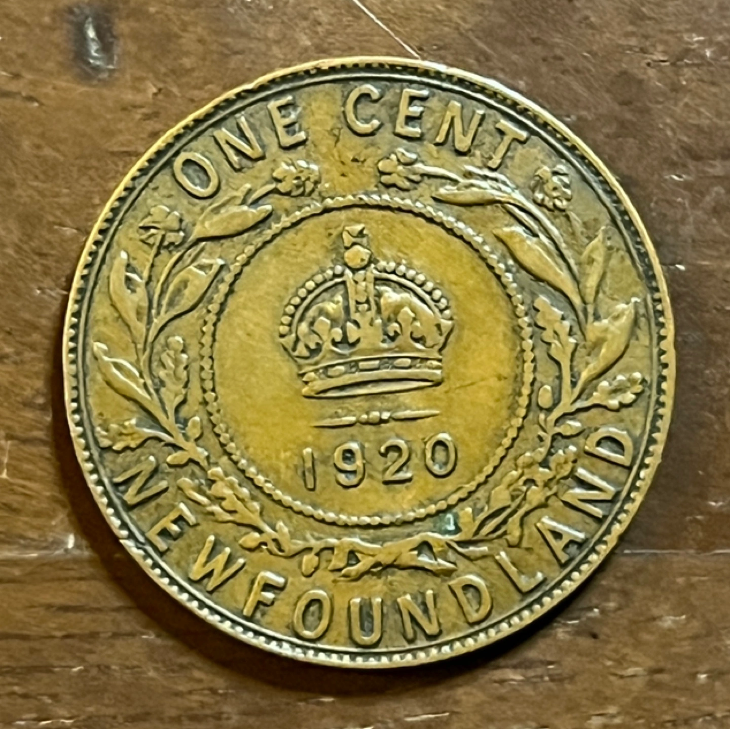 Vintage one cent coin from Newfoundland. Features King George V on one side and a crown with floral design on the other. Dated 1920.