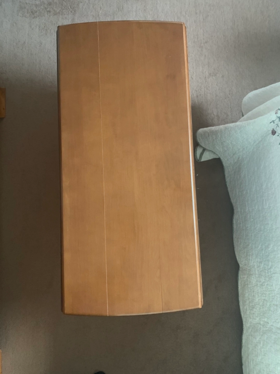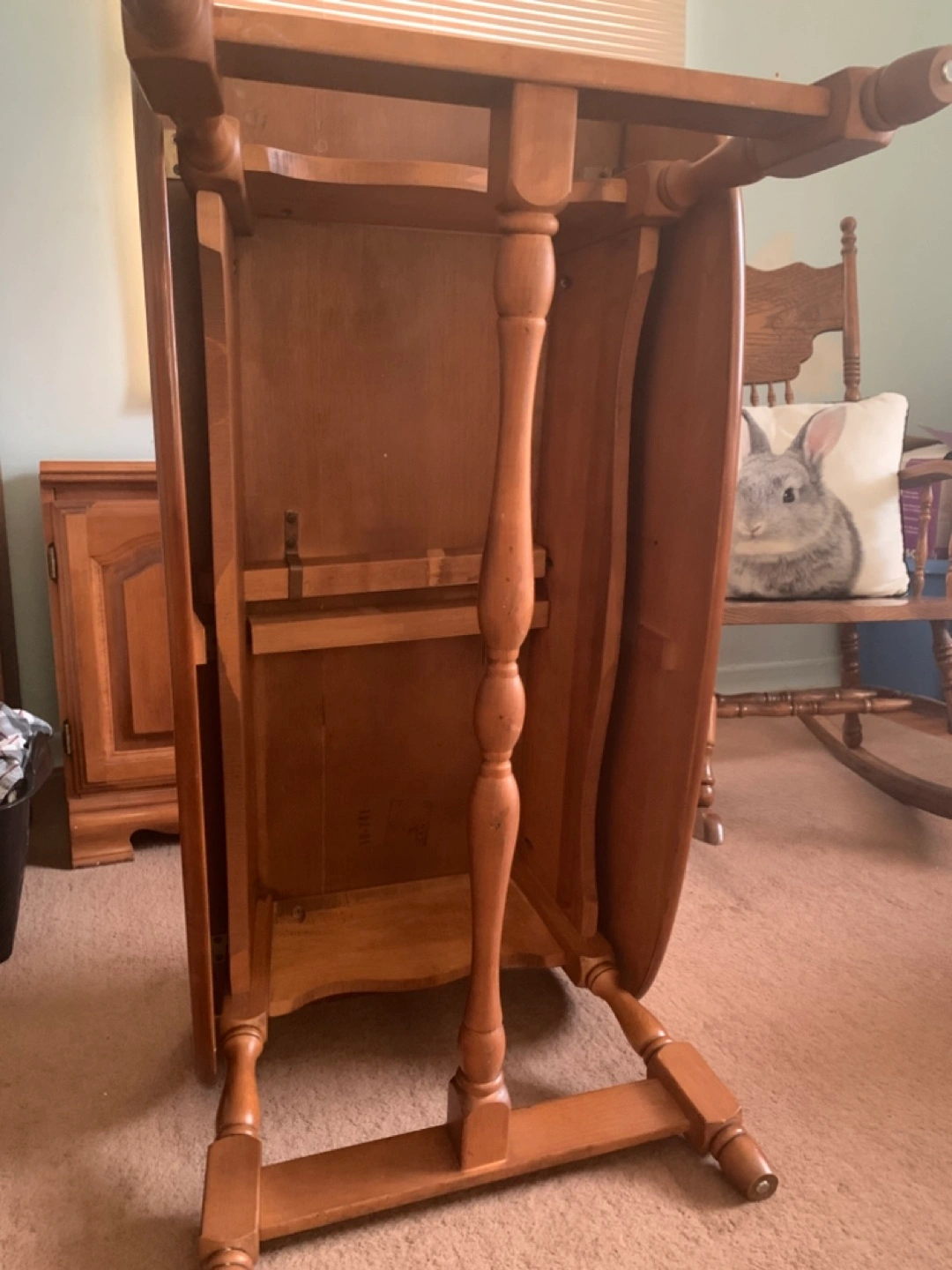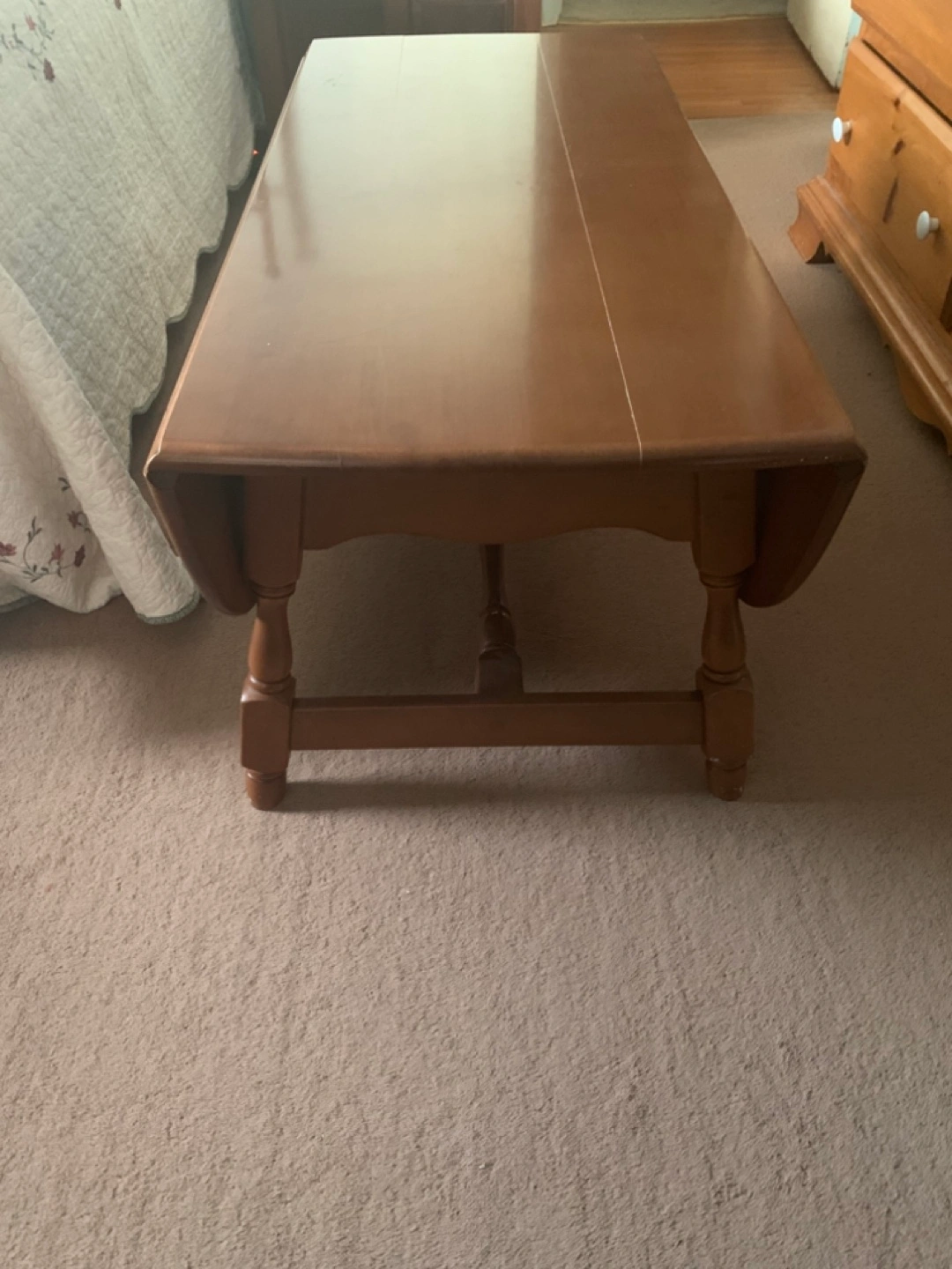 This is a solid wood coffee table. The drop leaves can be raised into position, one or both. Canadian made by VILAS. Dimensions are 18” x 40” with leaves down or 37” x 40” with leaves up. The height is 18”. Some marks/ gouge on base.
