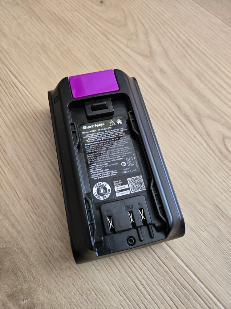 SharkNinja cordless vacuum charging battery pack. Black plastic. Purple accent. Model number XVT8625KDC shown on label.