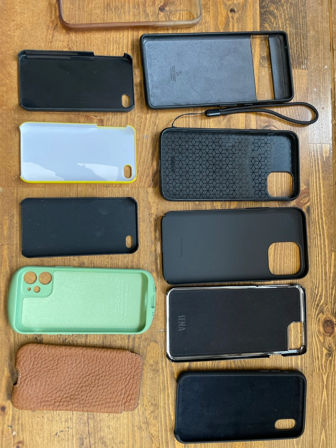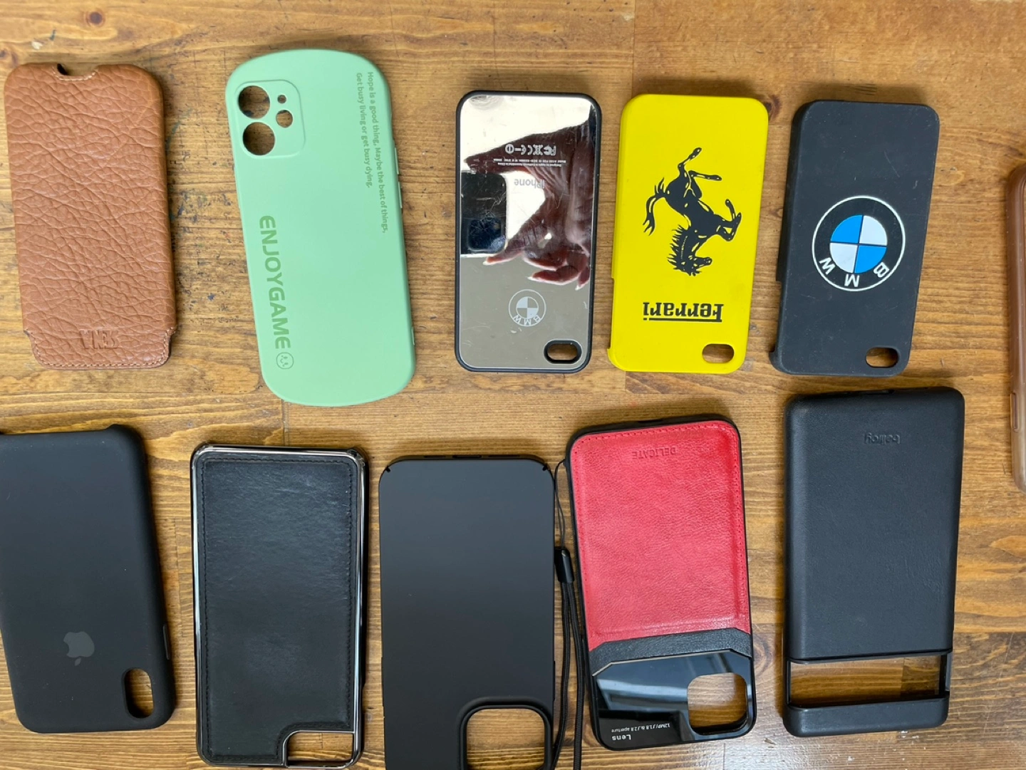 Assortment of pre-owned iPhone cases. Different colours, materials, and styles. Includes brands like Enjoygame, BMW, Ferrari, and others. All for $50