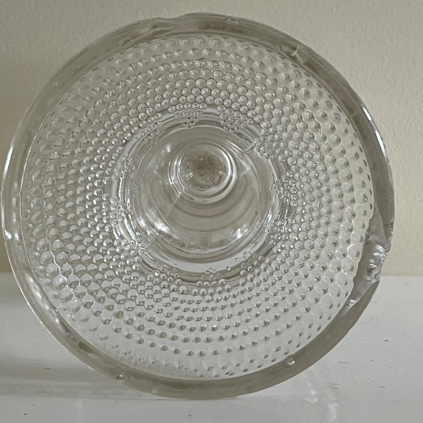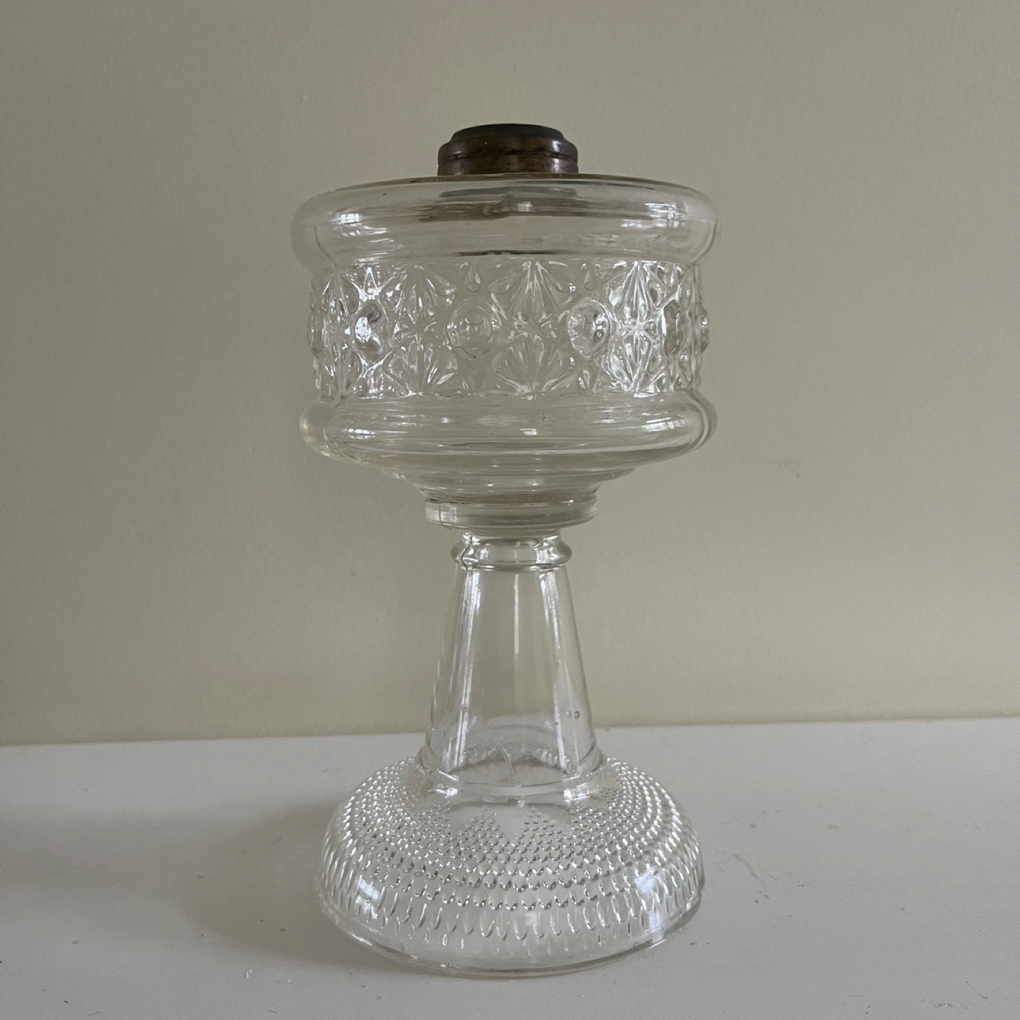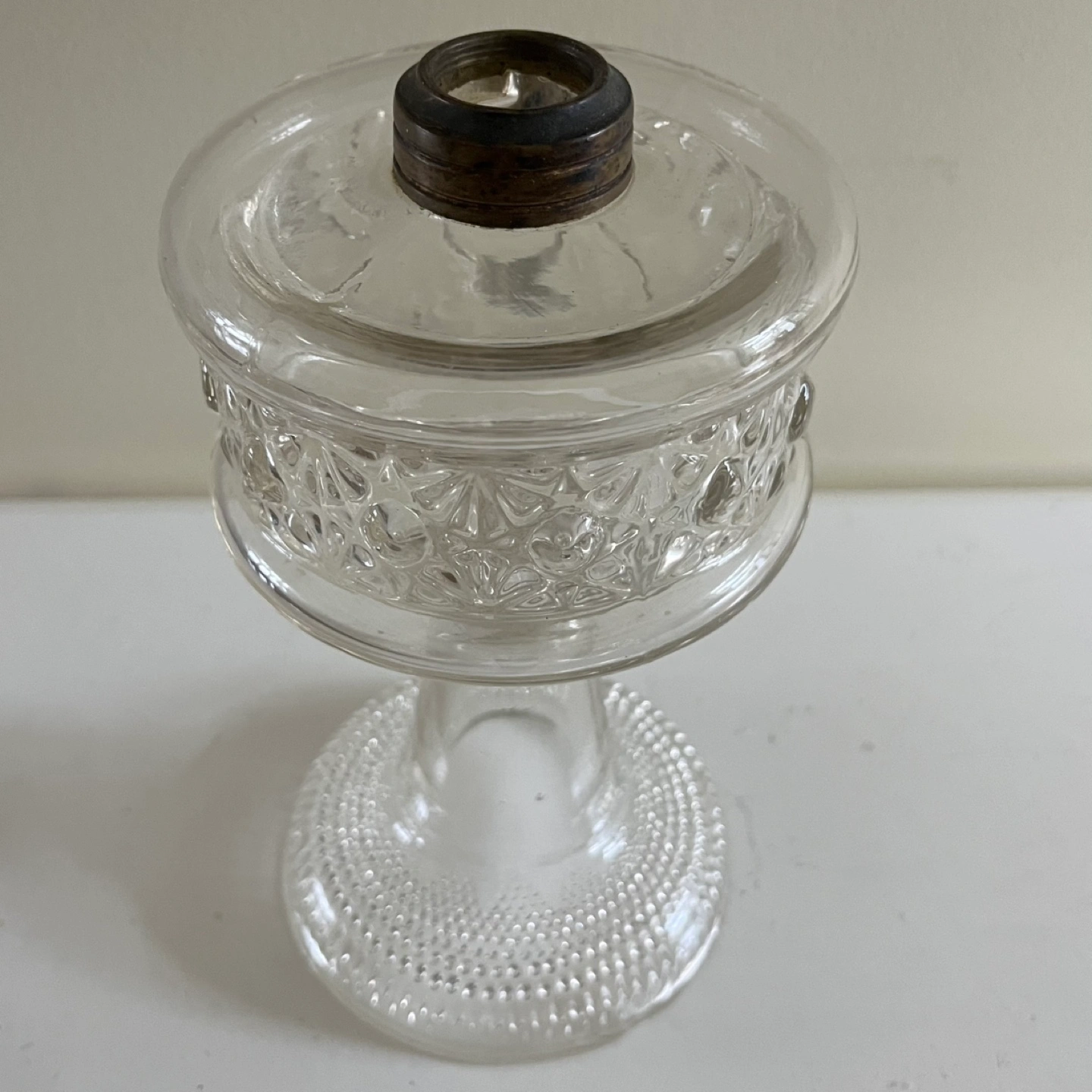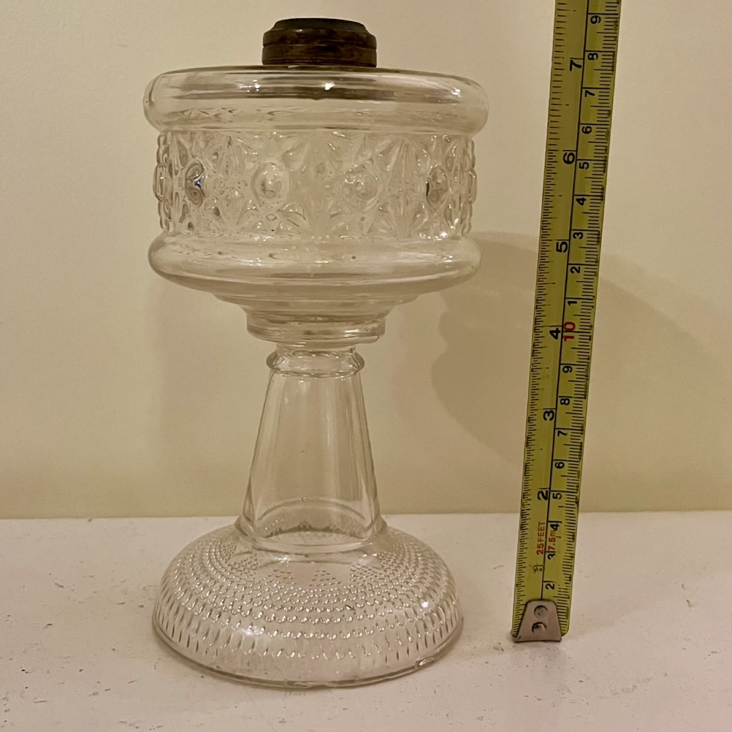 Add a touch of vintage charm to your home with this beautiful antique glass oil lamp, with a daisy and dew drop base. It is likely Victorian, from the late 19th or early 20th century. There are some small imperfections on the underside, not affecting the lamp’s appearance or function.