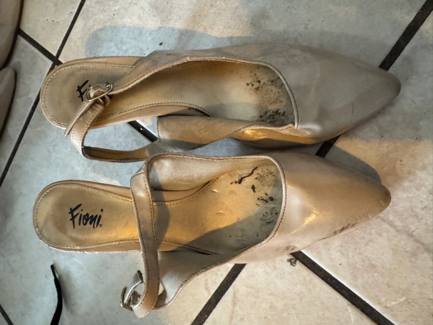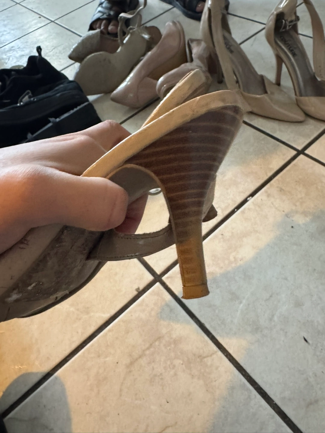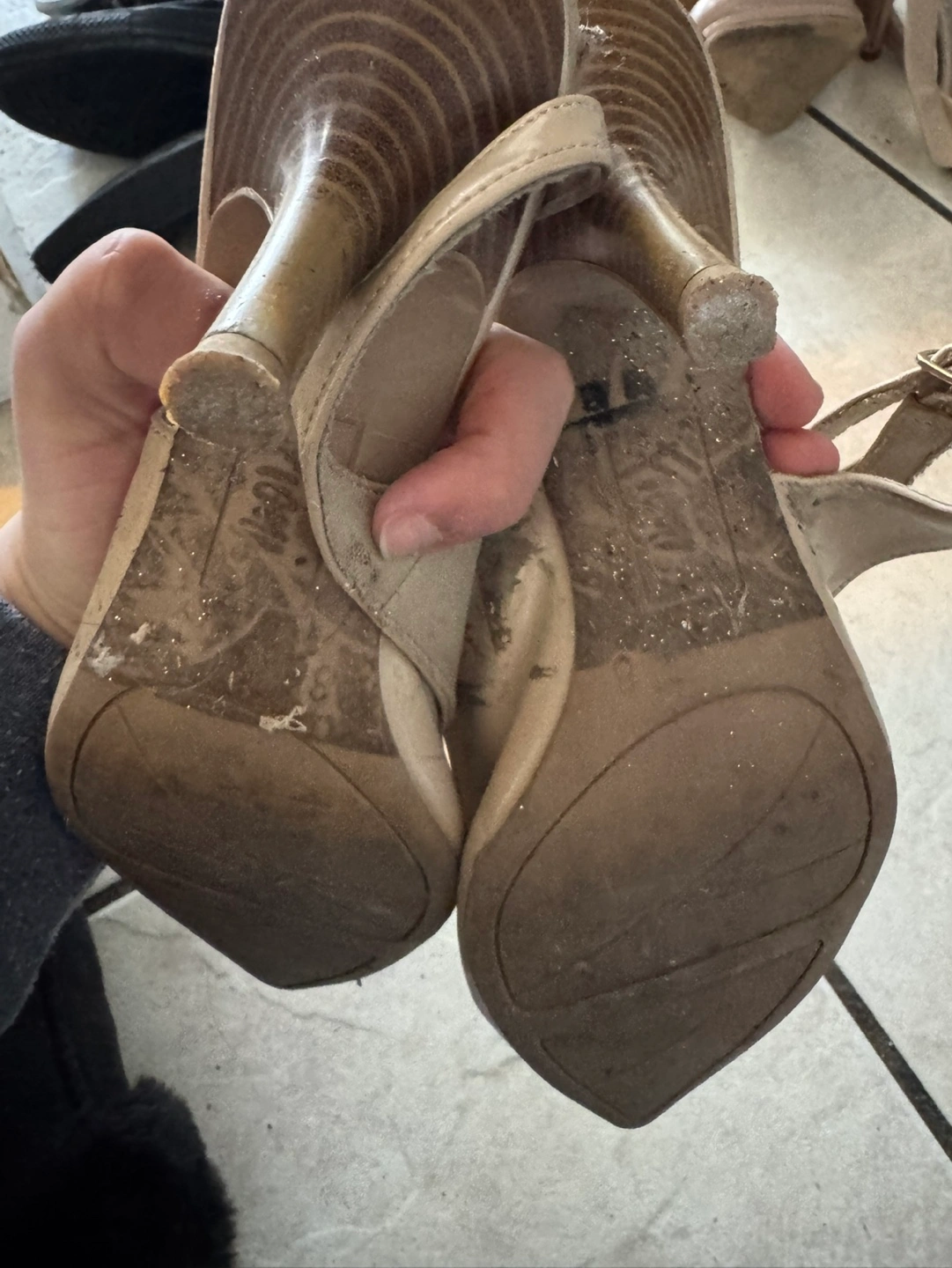 90Pair of beige slingback heels. Low heels. Some wear and tear. Used condition.