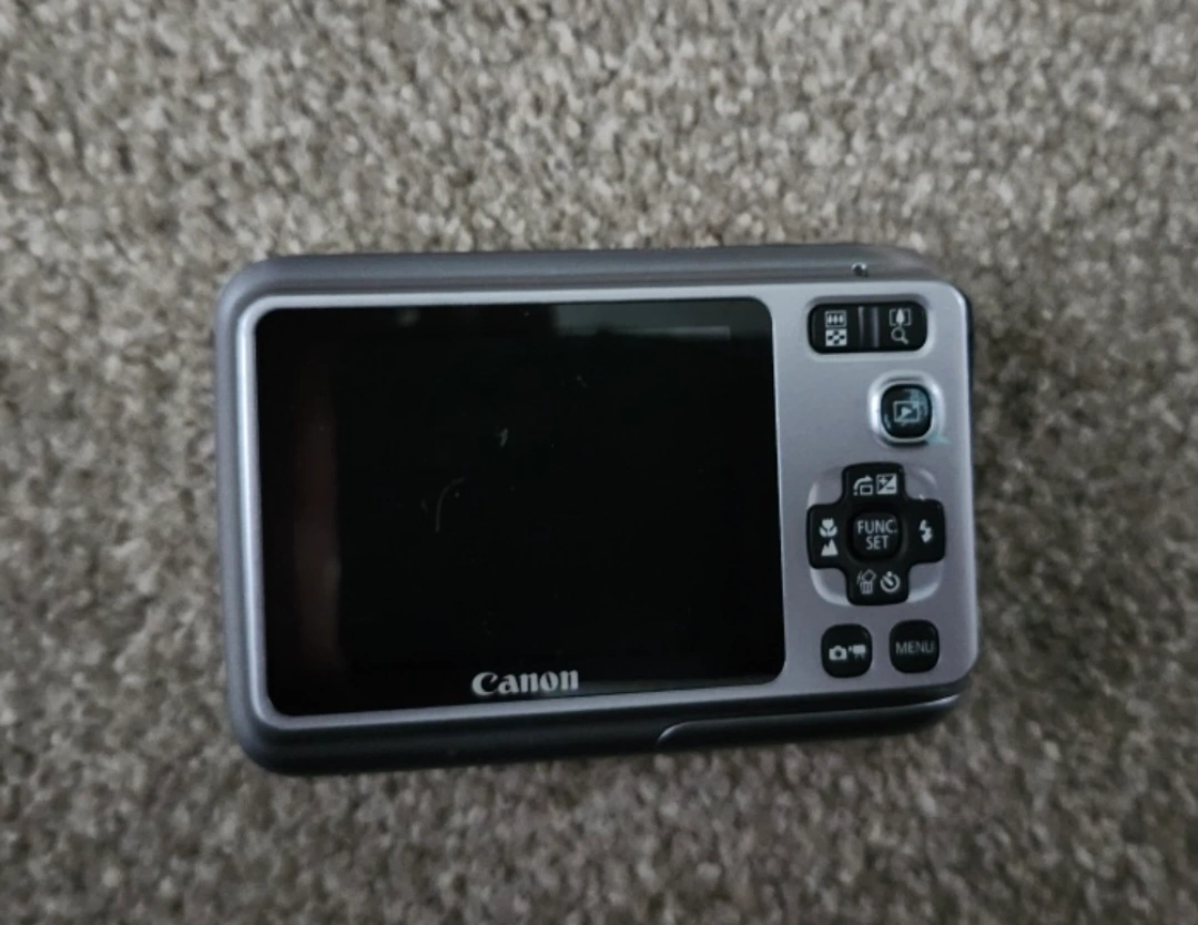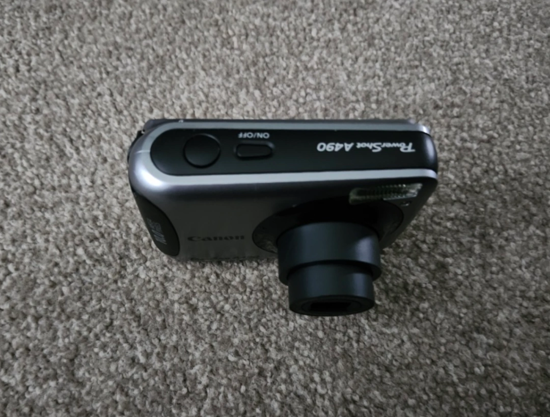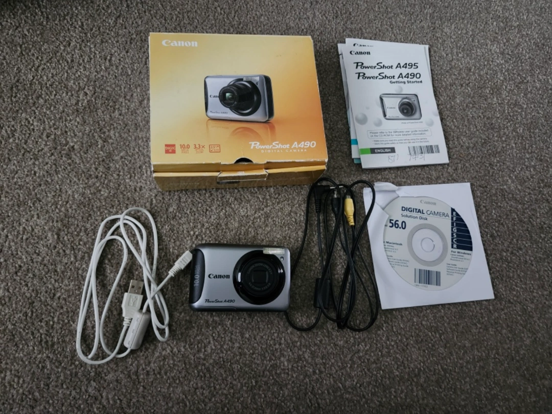 Canon PowerShot A490 digital camera. Includes original box, instruction manuals, USB cable, AV cable, and installation disc. Compact and easy to use. Great for everyday snapshots.