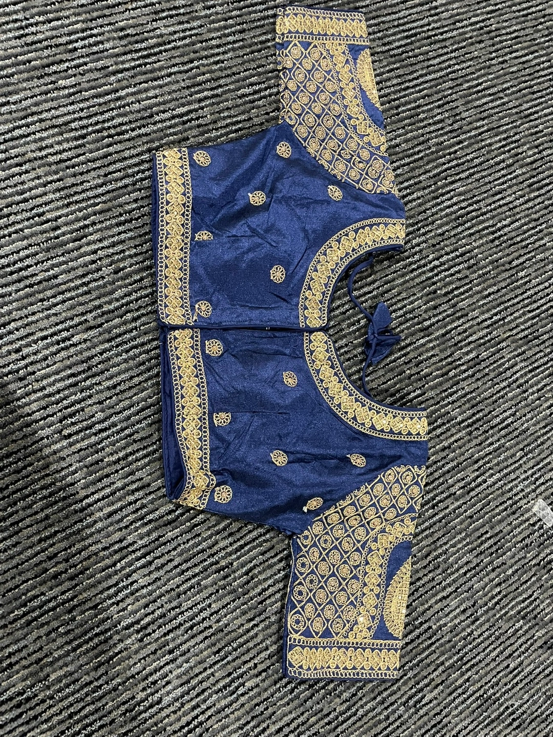 Stunning navy blue blouse. Intricate gold embroidery. Short sleeves. Back hook closure. Ready to wear.
