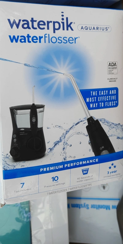 44Waterpik Aquarius water flosser. Includes seven tips. Ten pressure settings. Ninety second water