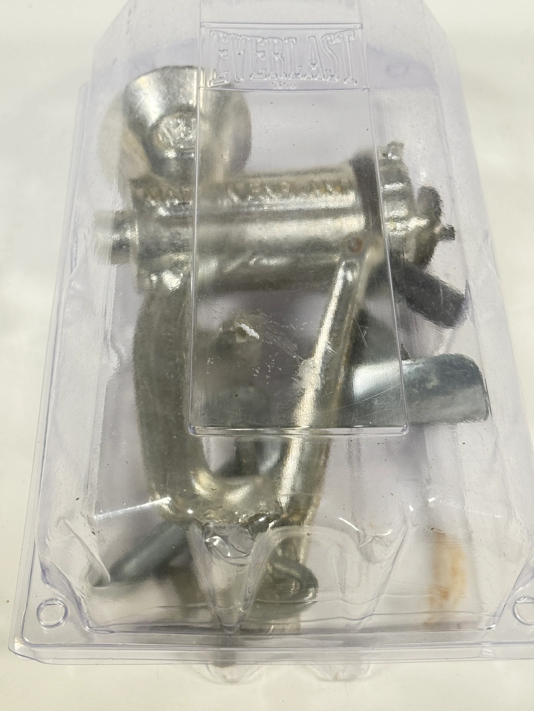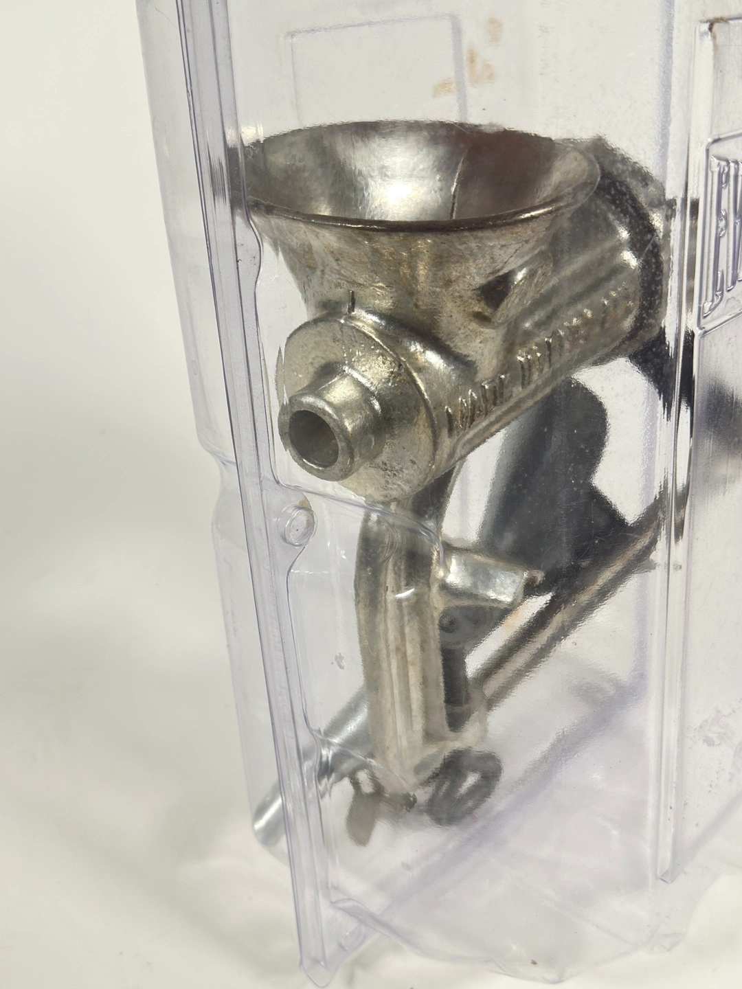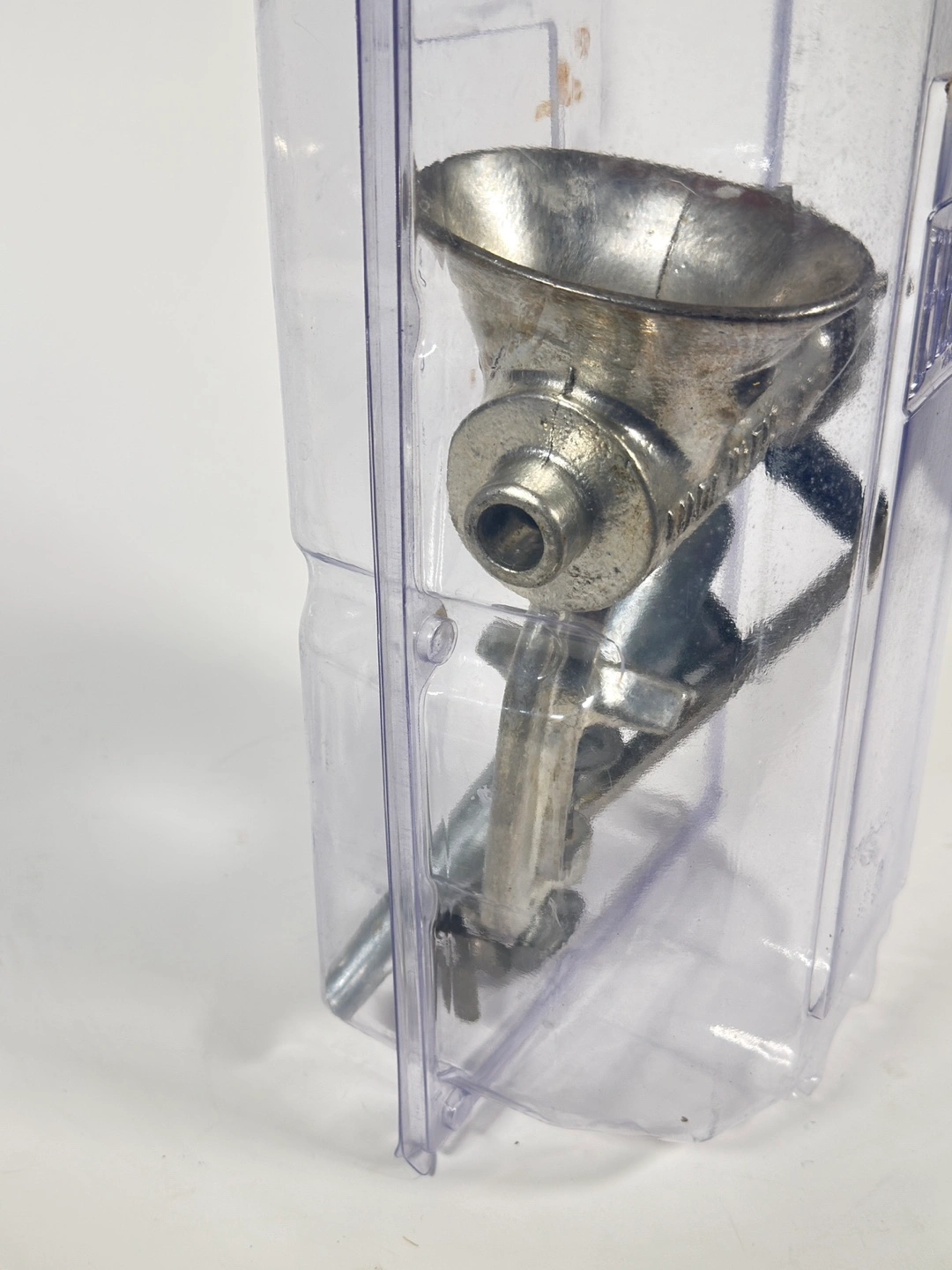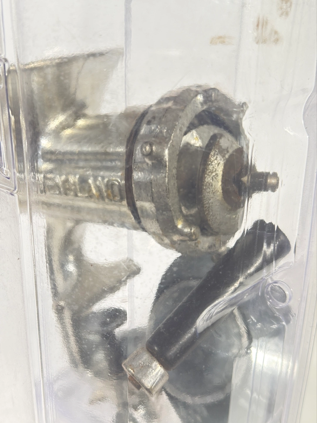 643Miniature vintage hand crank meat grinder. Metal construction. Comes in clear plastic case. Excellent for collectible purposes. Made in England