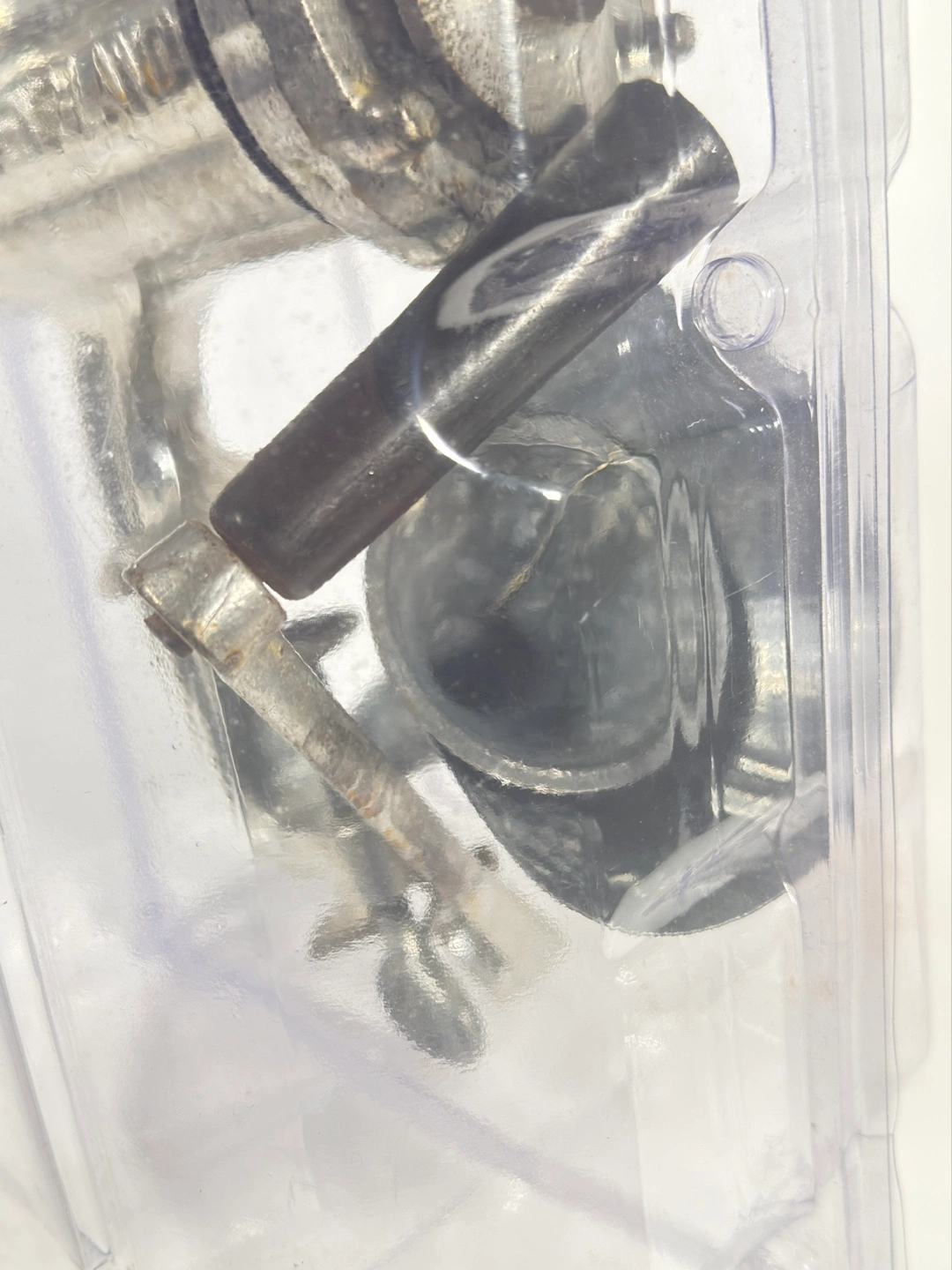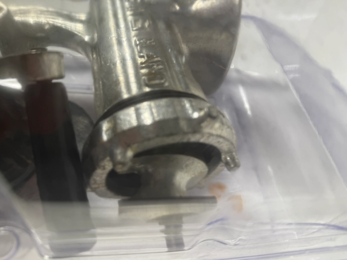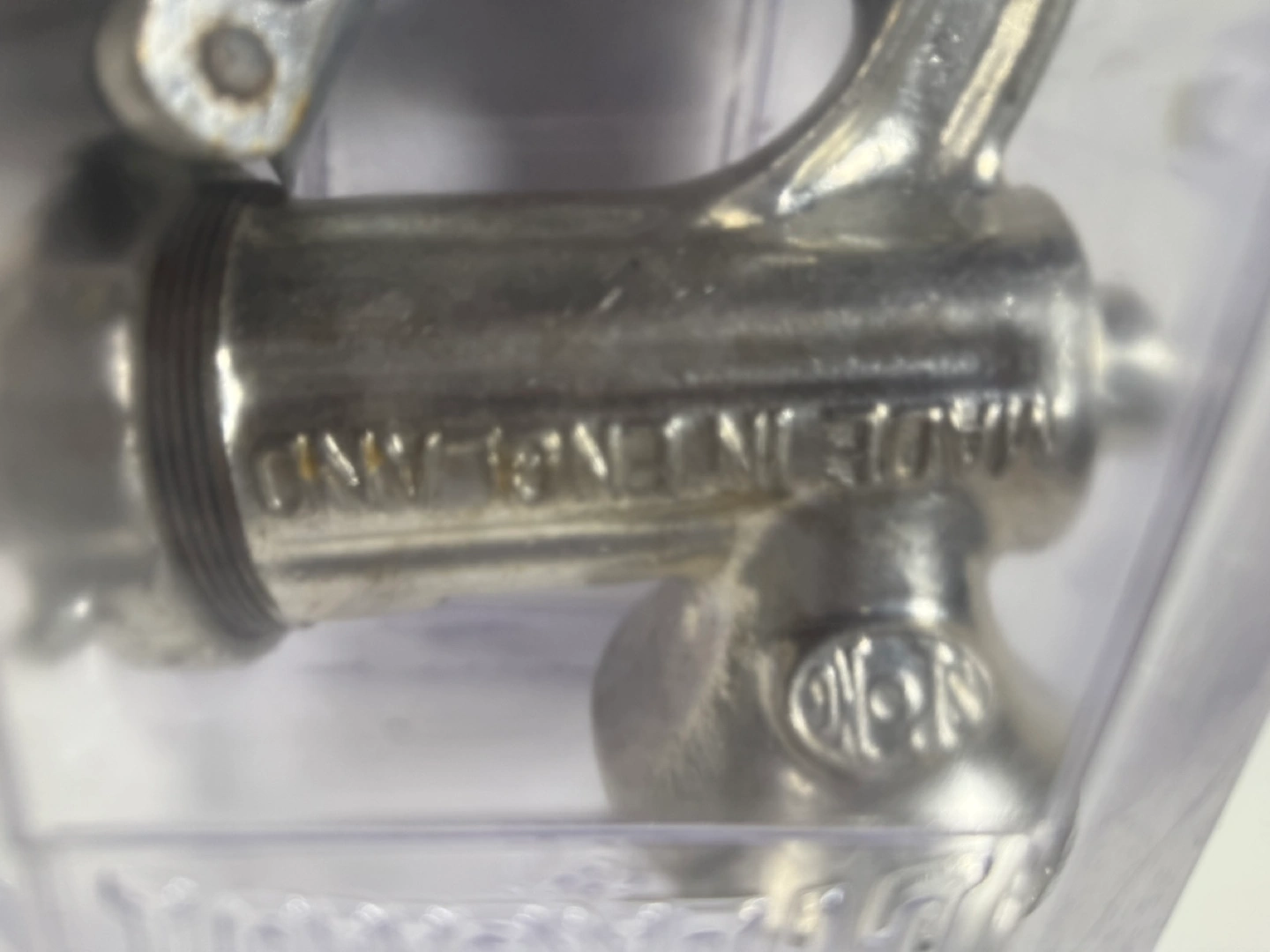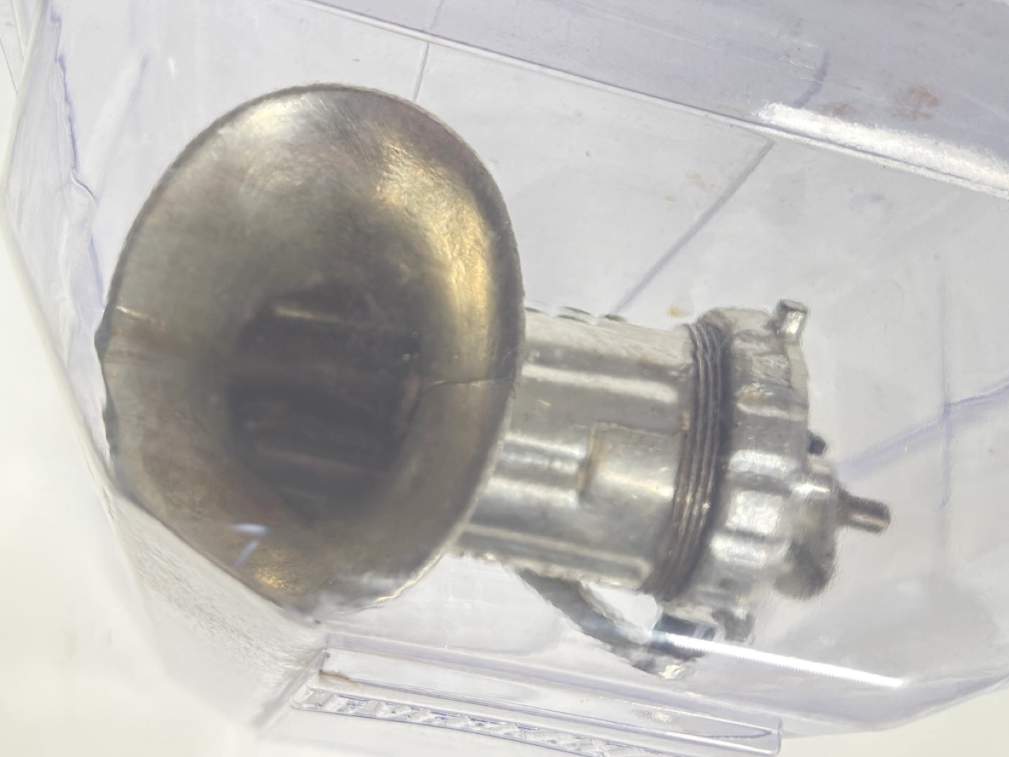 643Miniature vintage hand crank meat grinder. Metal construction. Comes in clear plastic case. Excellent for collectible purposes. Made in England