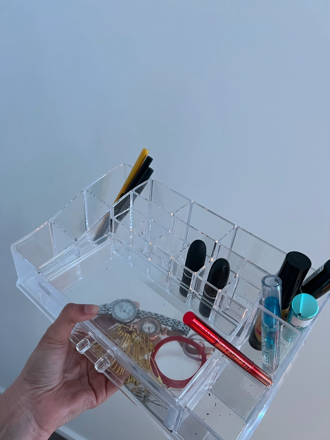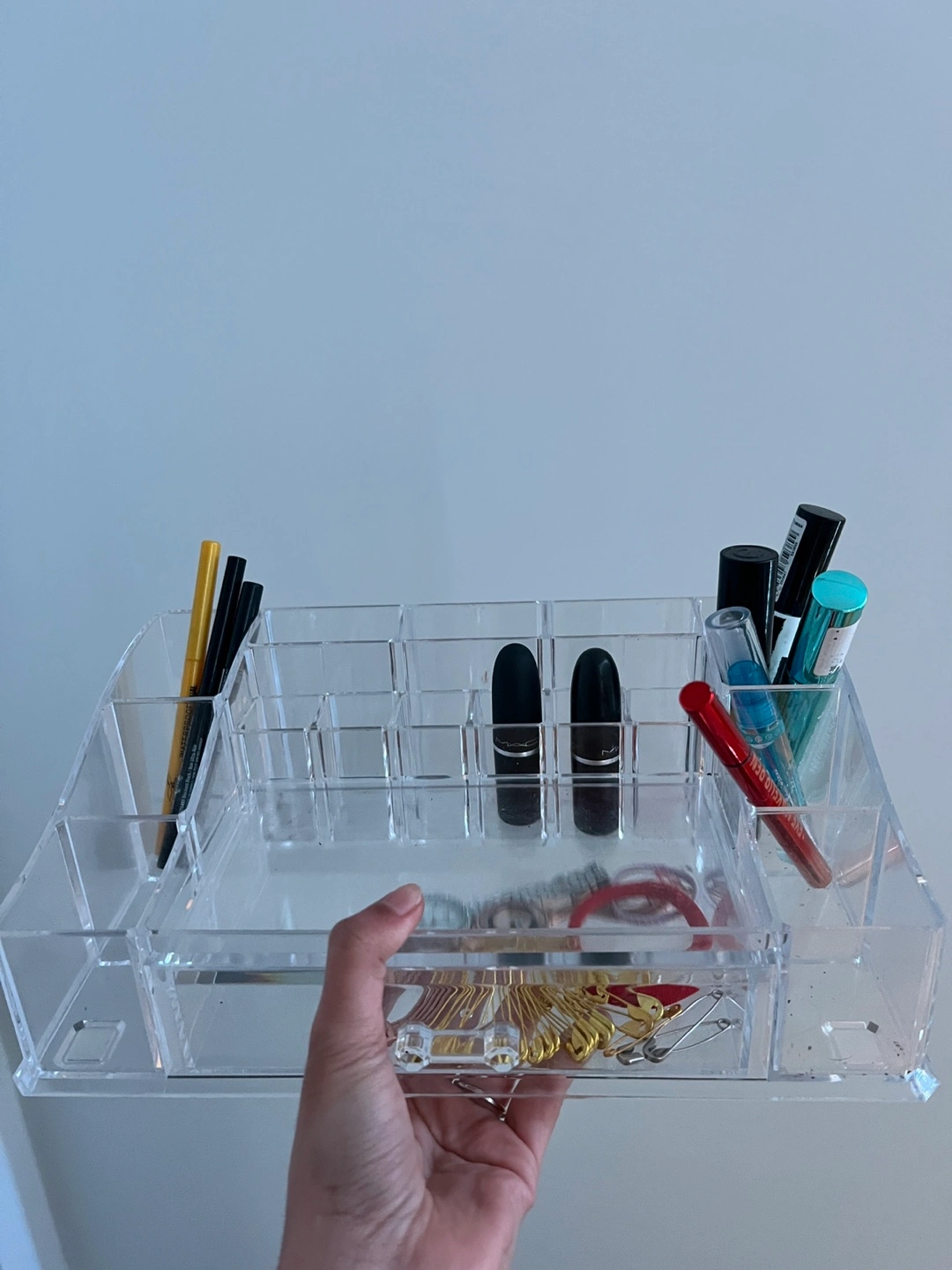 Clear acrylic makeup organizer. Multiple compartments. Pull-out drawer. Perfect for storing cosmetics, jewellery, and more. Gently used.