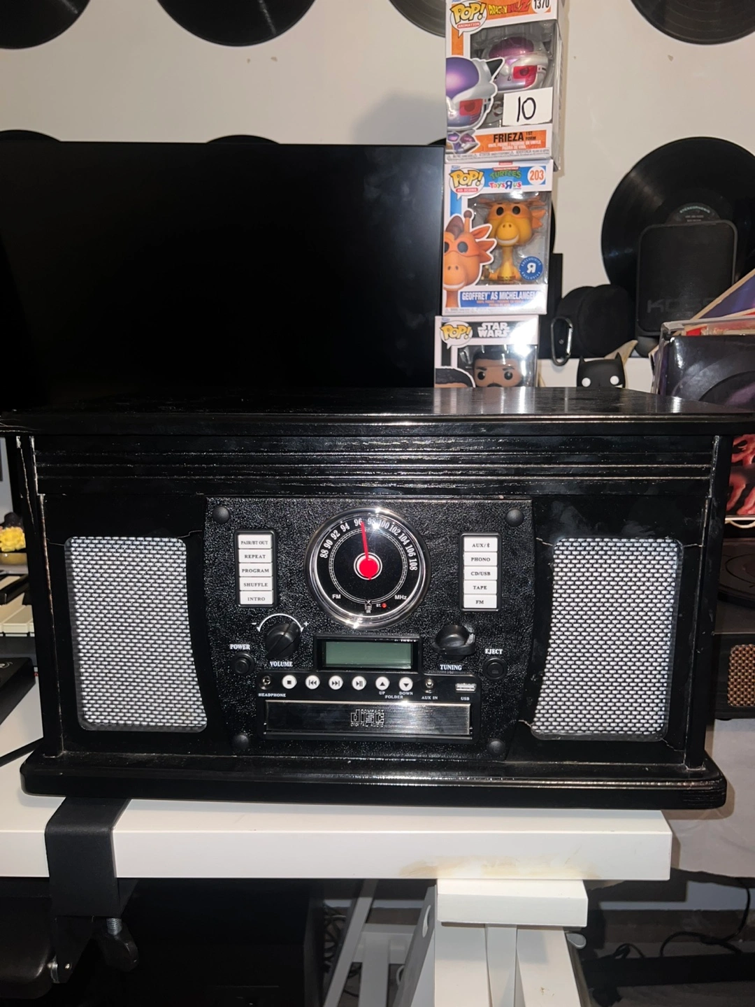 Victrola record player. Plays 3 speeds. Bluetooth and AM/FM radio capabilities. USB and aux and cassette inputs. Excellent condition.