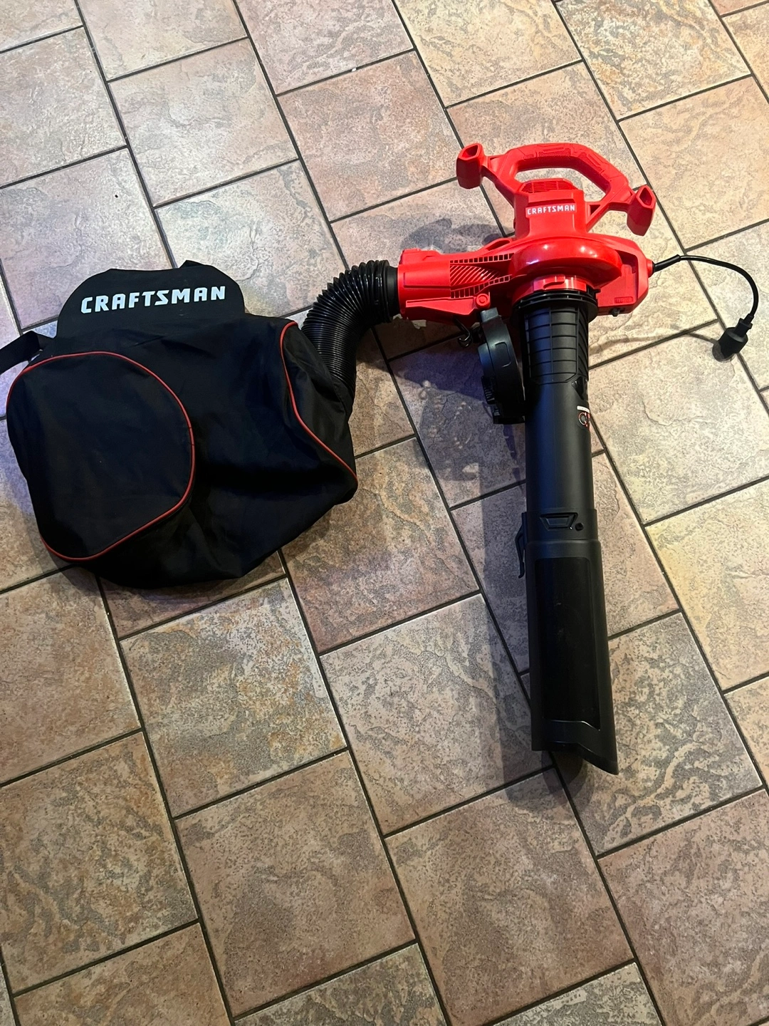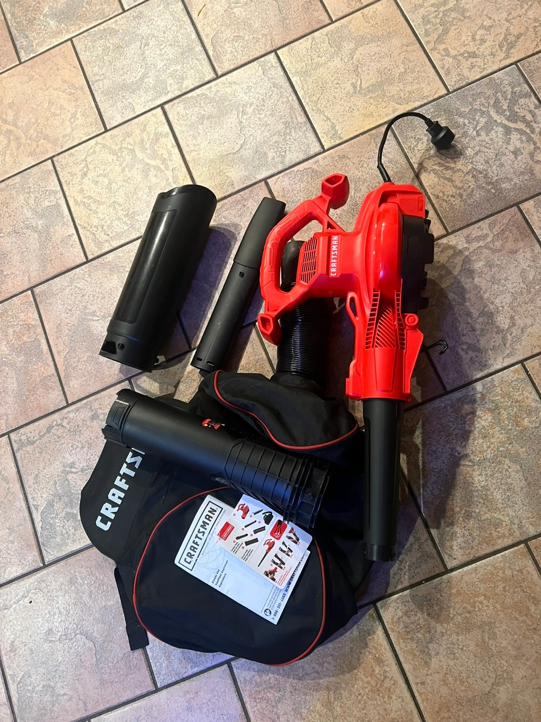 Corded leaf blower. Red and black. Includes multiple attachments and storage bag. Great for cleaning leaves and debris.