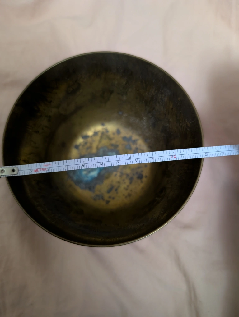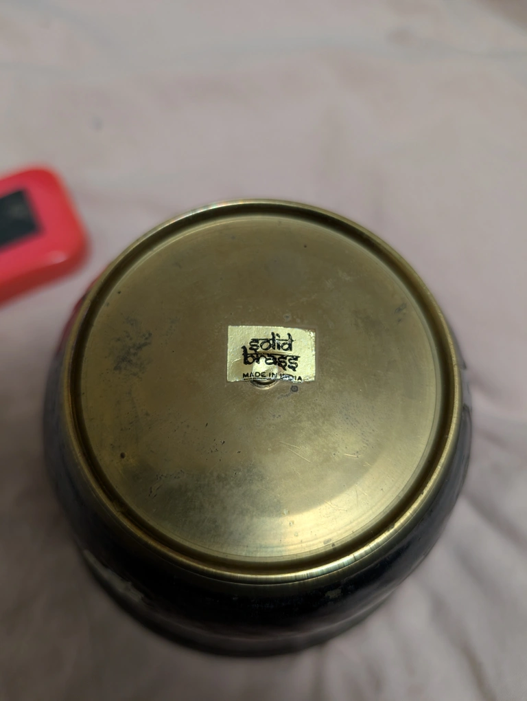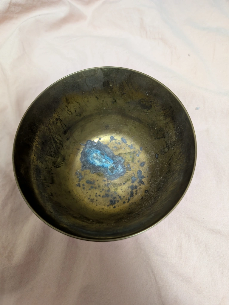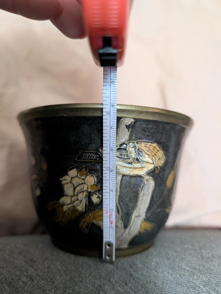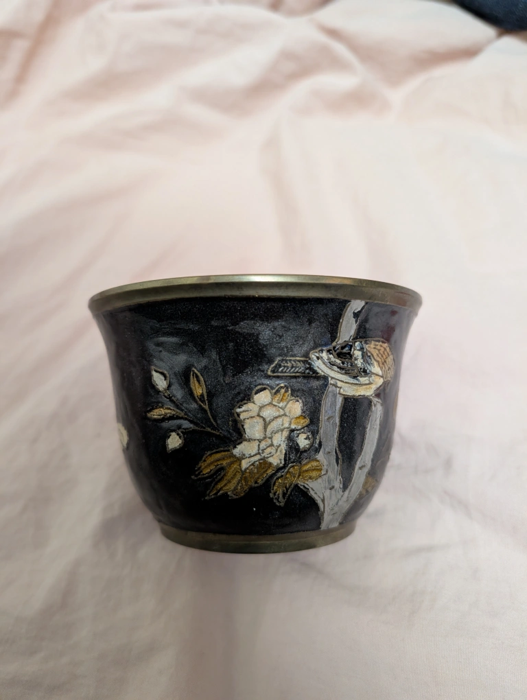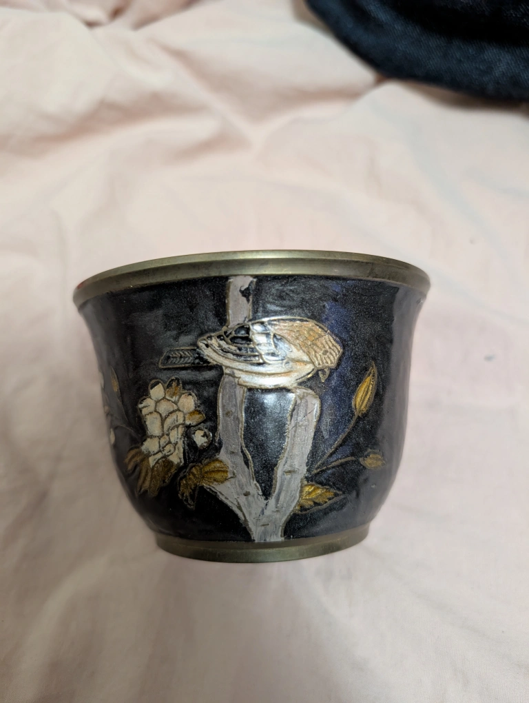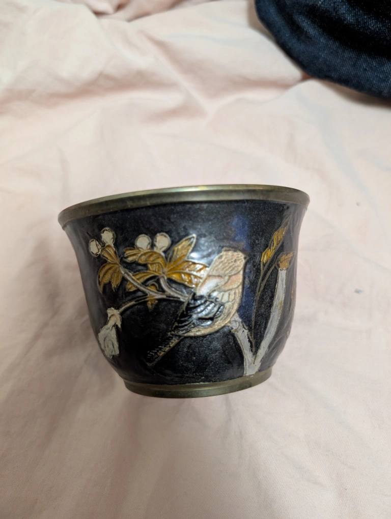 Vintage enamel brass hand painted bowl.Features an etched design of a bird perched on a branch with flowers. Dark background with gold and silver accents. Approximately 3 inches tall and 4 inches in diameter. Meet up by Keele and Rogers