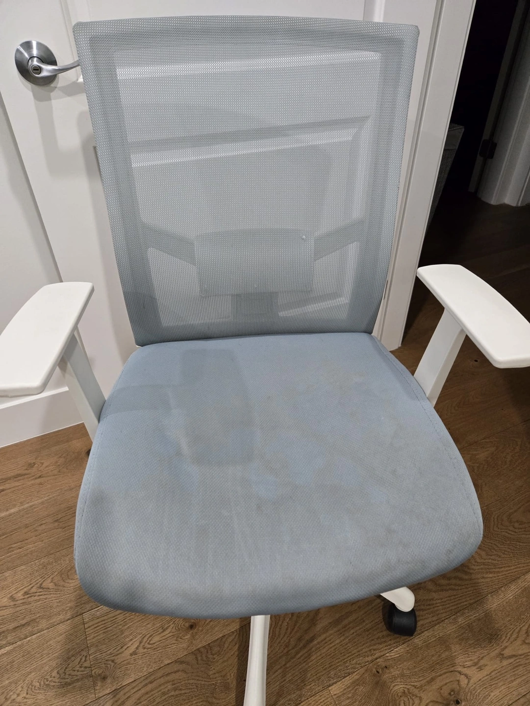Comfortable office chair, light blue fabric seat and mesh back. White plastic frame and armrests. Five caster wheels. Some light stains that can be spot washed.
