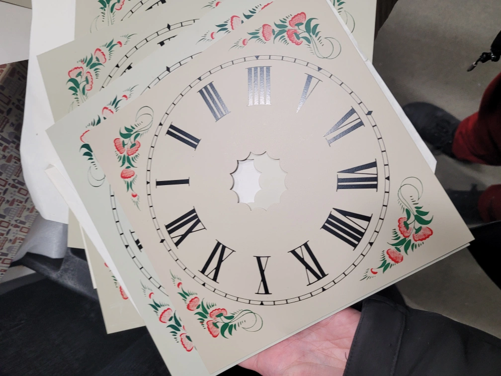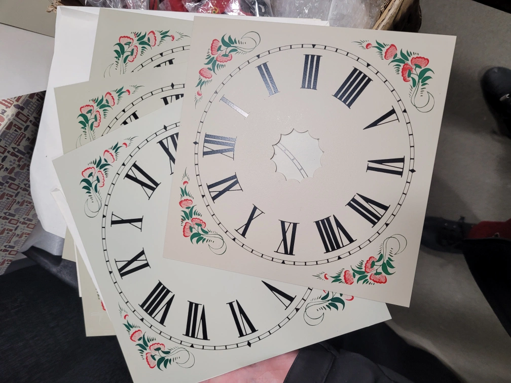 various sizes slightly different replacement metal clock faces. some white some Off-white background. Roman numerals. Floral design. Great for restoration projects or crafting. look like lithograph printing. very neat. price is per piece.