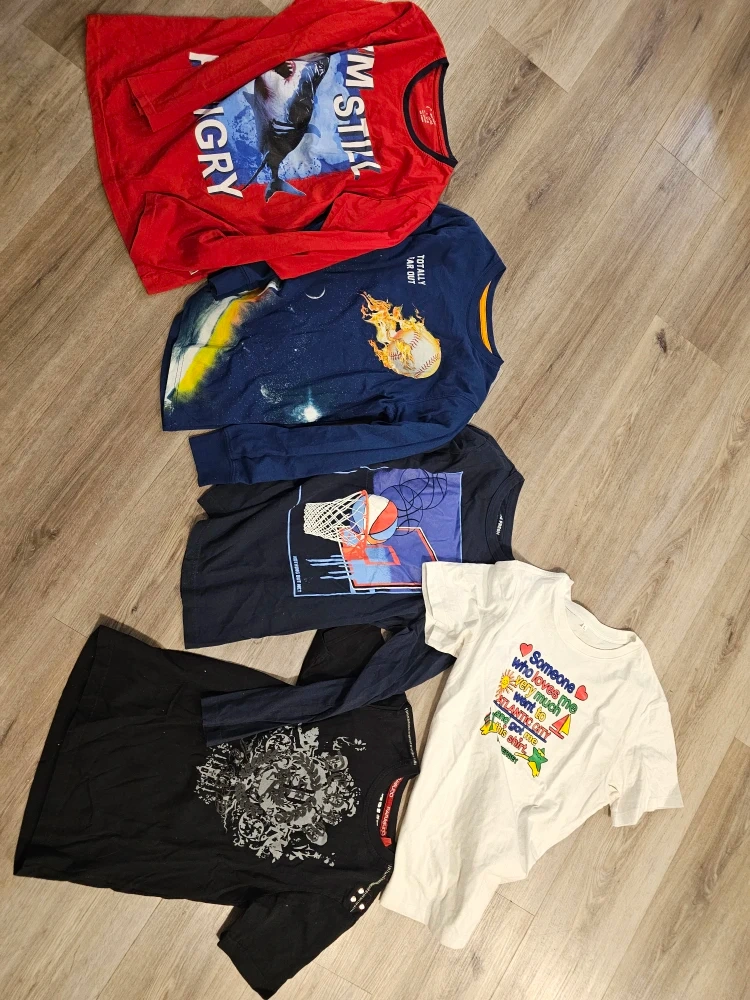 Selling a bundle of 7 boys' long sleeve shirts, size 5/6. There's a mix of different designs and brands, perfect for everyday wear! They're in great condition and ready for a new home.