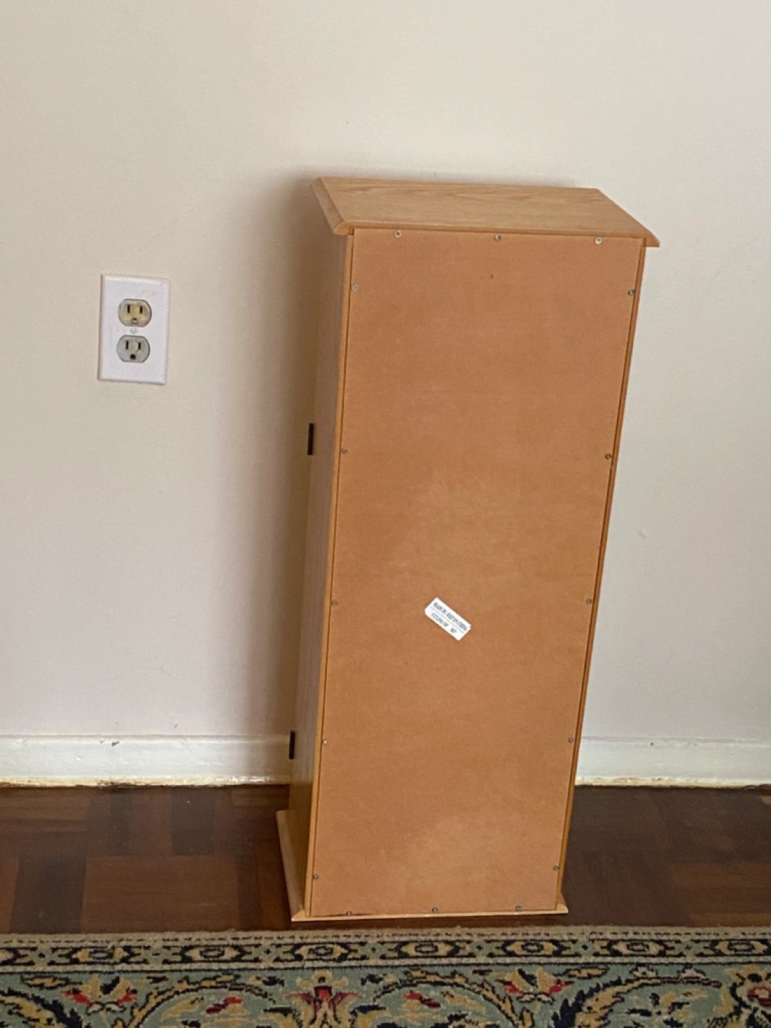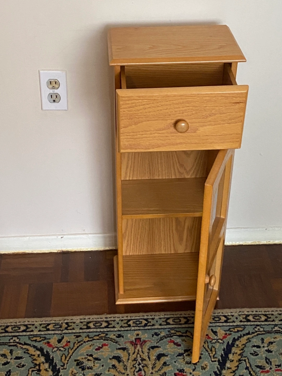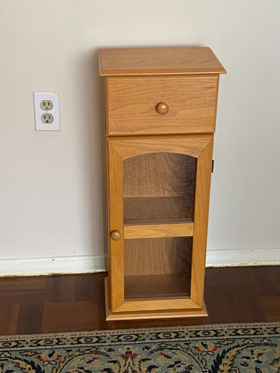 Small wooden cabinet. Features one drawer and a glass-paned door concealing two shelves. Light oak finish. Ideal for storing collectibles or small items.