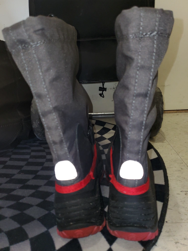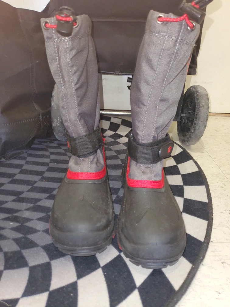 Gray and red waterproof snow boots. Size 5. Good condition. Features drawstring closure at top and hook and loop strap.