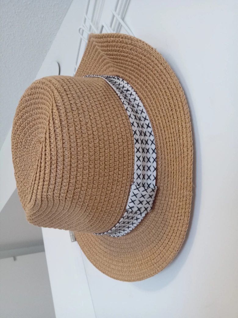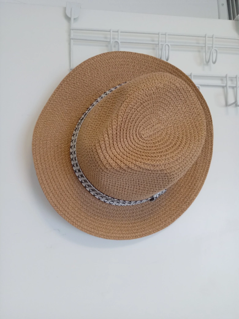 277Lightweight summer hat. Brown straw. Features a decorative band with a black and white pattern. Great for sunny days.