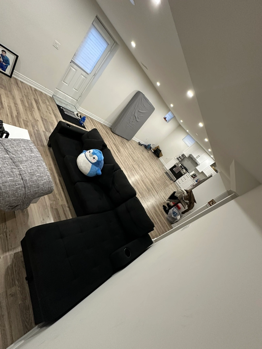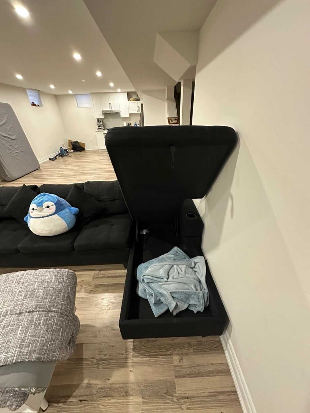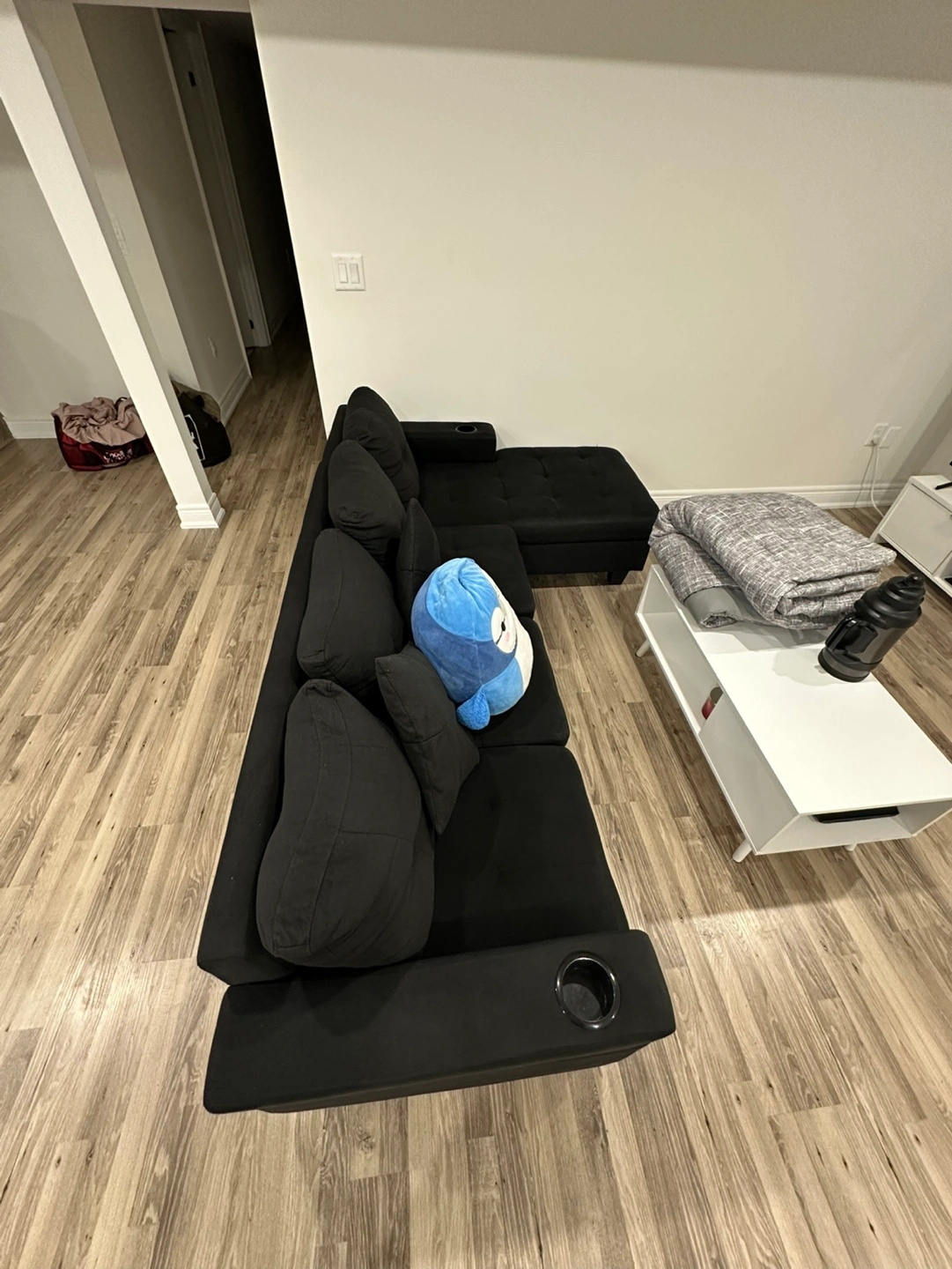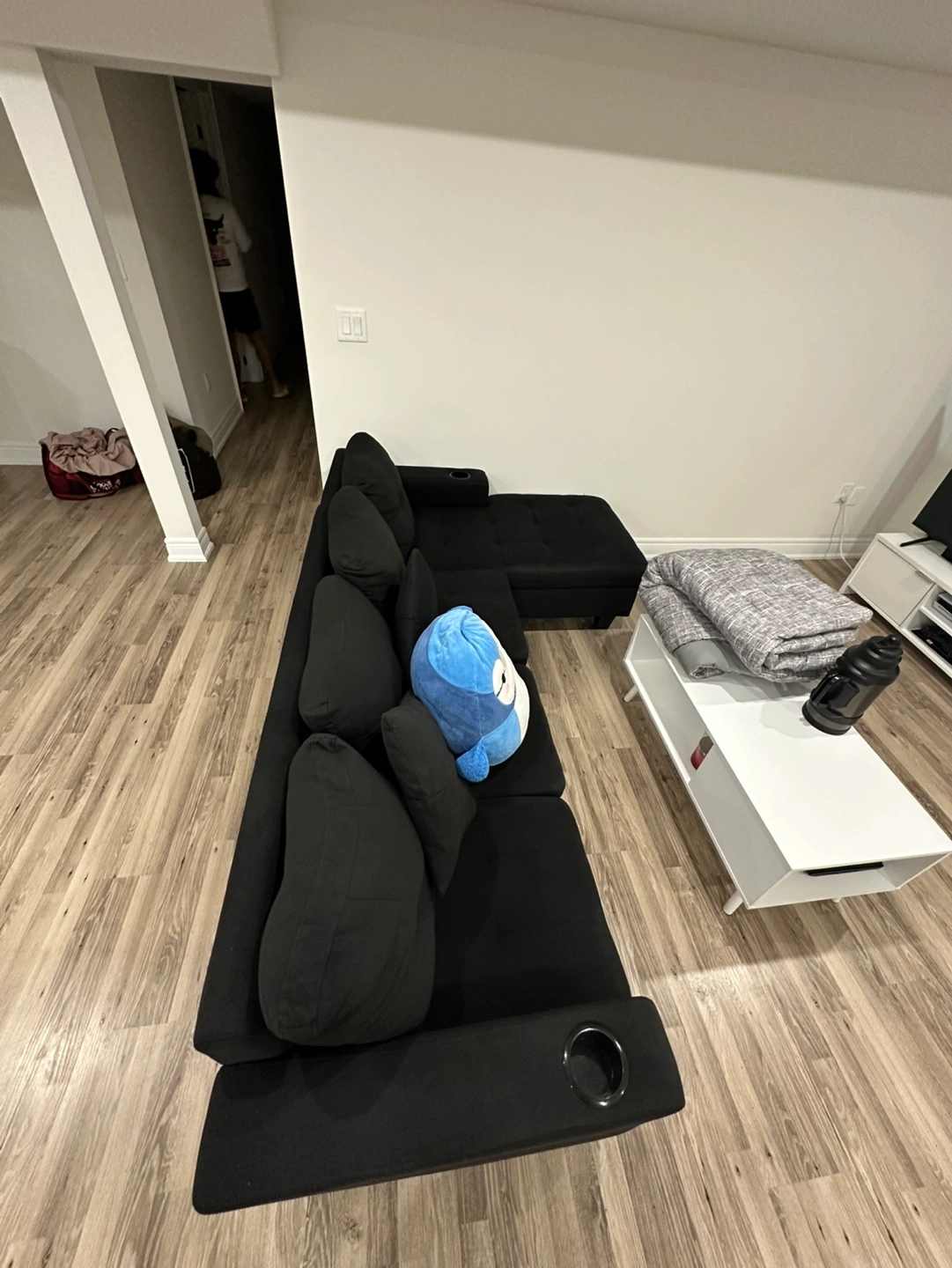 Comfortable black fabric sectional sofa. Features a chaise lounge and built-in storage. Includes cup holders. Good condition.