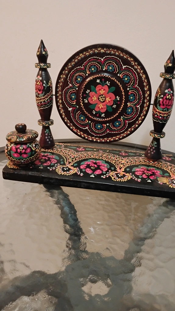 Unique hand-painted wooden vanity mirror set. Features a round mirror framed with intricate floral designs. Includes a small matching painted container. Dark brown base colour with vibrant pink, green, and blue accents. Excellent collectible piece or decorative addition.