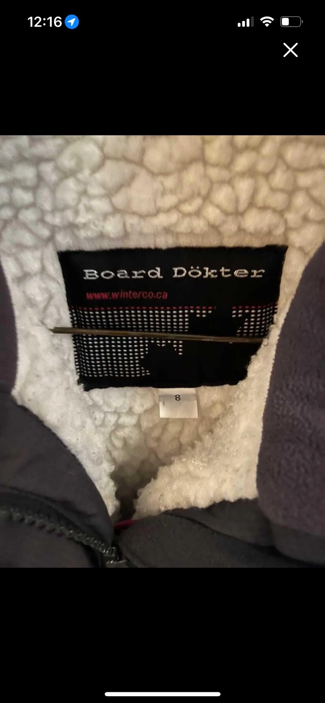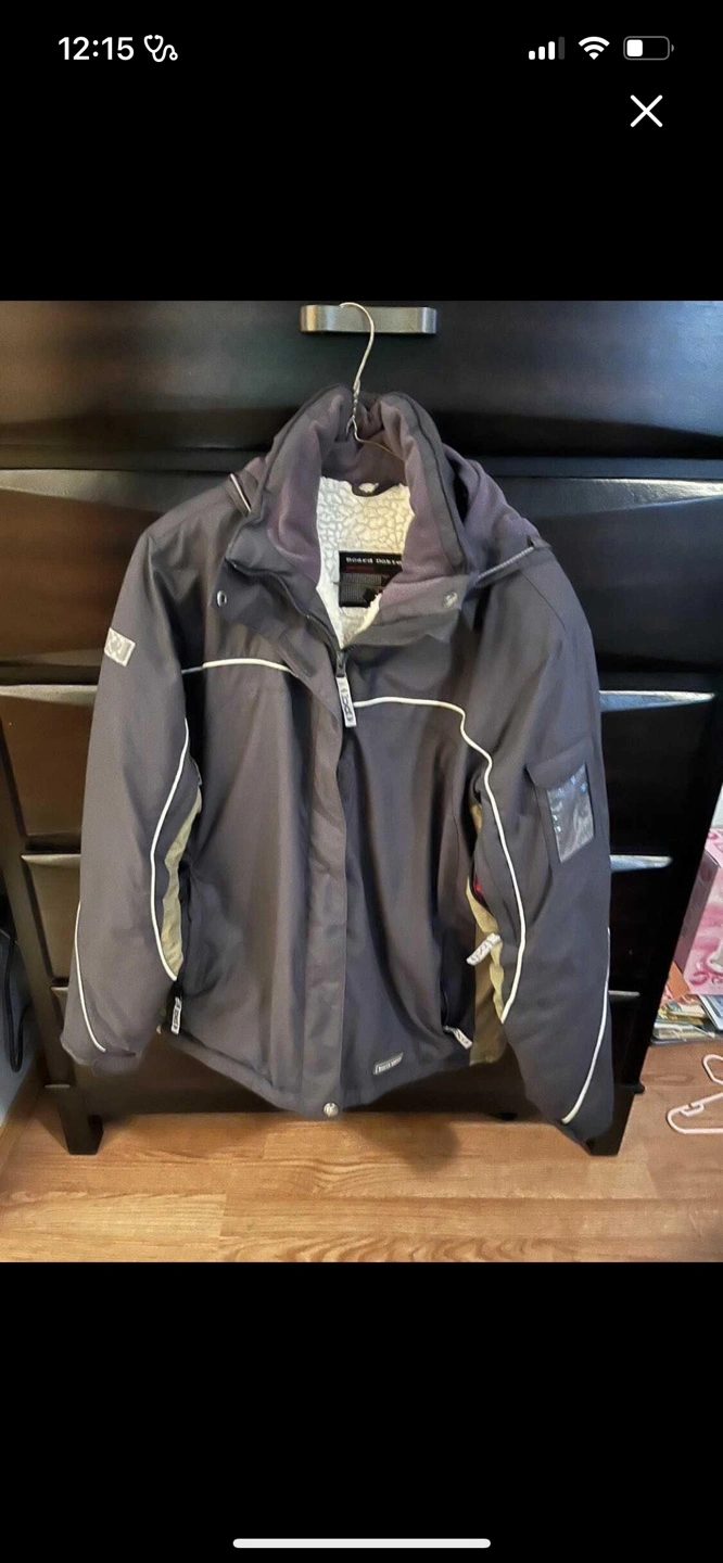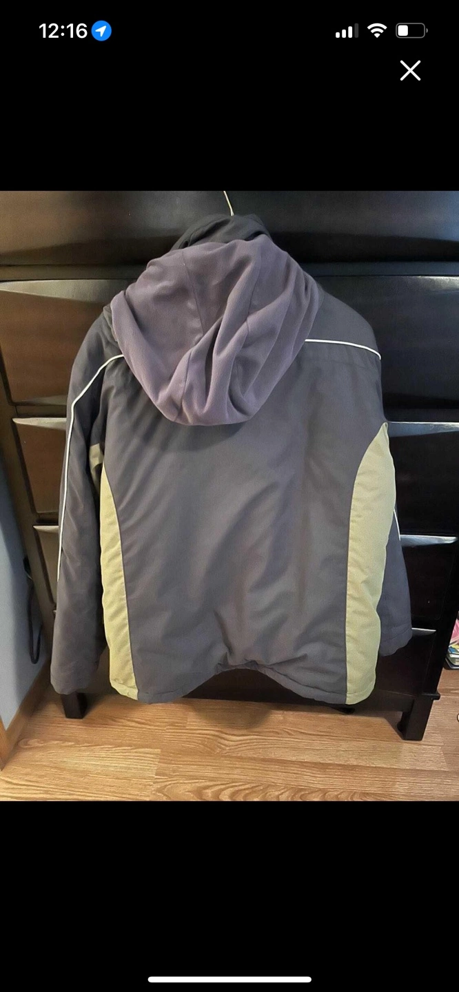 dark grey and beige ski jacket. Size 8. Features a fleece-lined hood. Good condition.