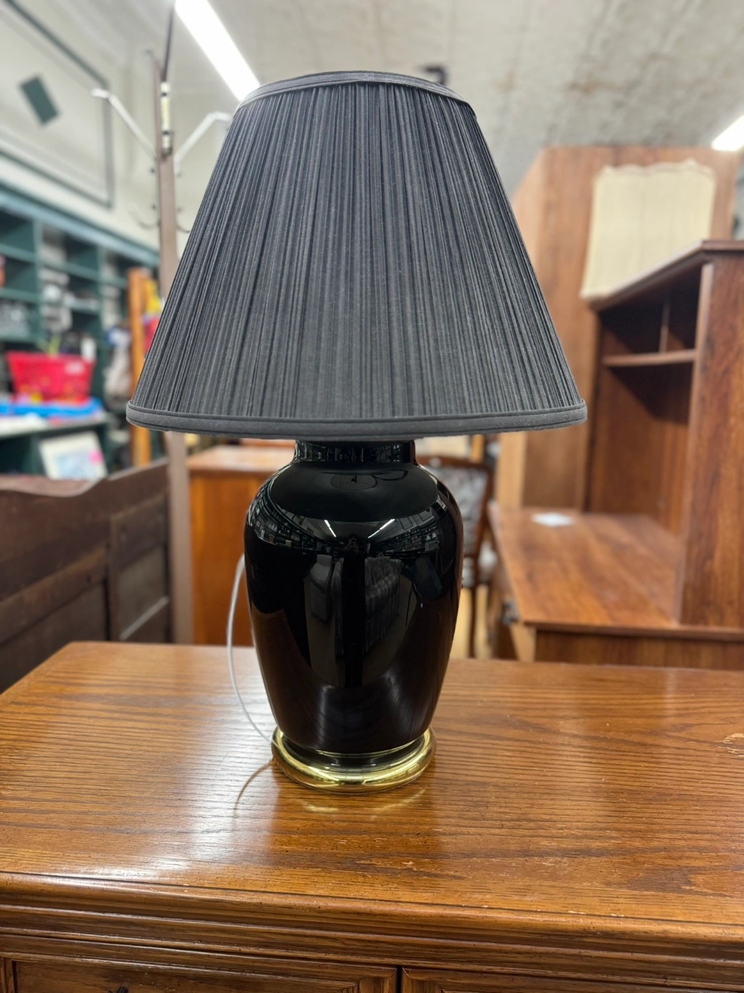 Elegant black table lamp. Features a pleated dark grey lampshade and a glossy black base with gold accents. Perfect for a bedside table or end table.