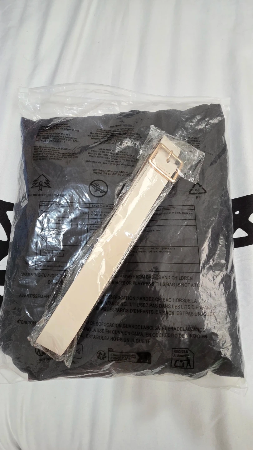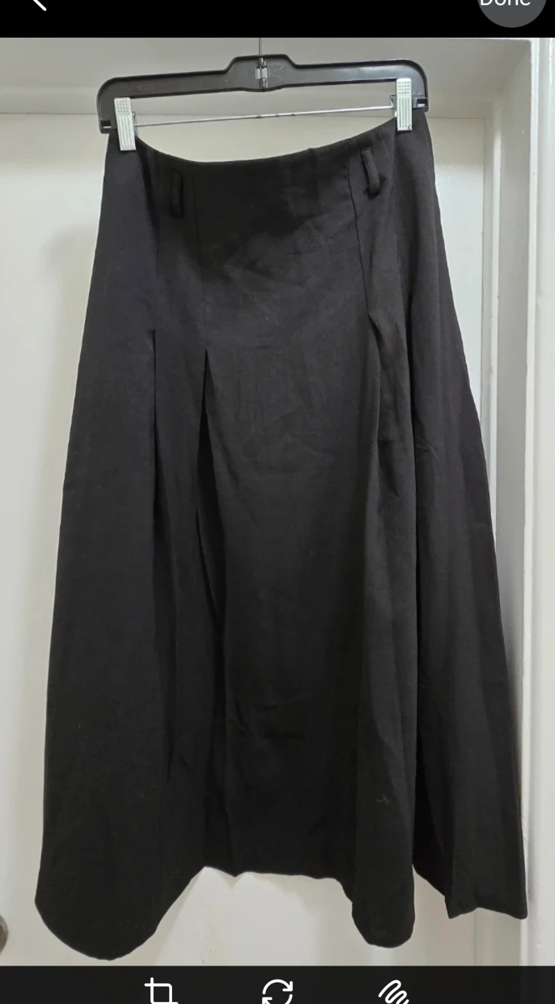 This black skirt comes with a matching belt. It features an elastic waistband and a pleated design. The fabric appears to be a polyester blend. Garterized on the back. Size large on tag.