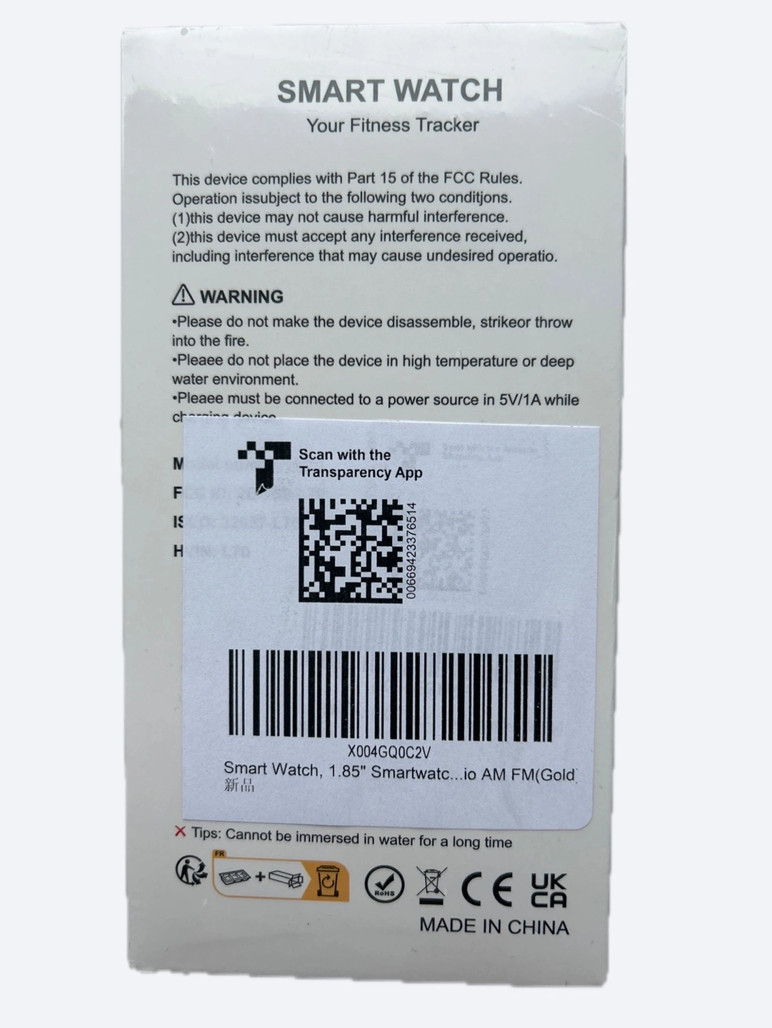 New smartwatch. Fitness tracker features. 1.85 inch screen. Gold colour. Includes instruction manual. Made in China.