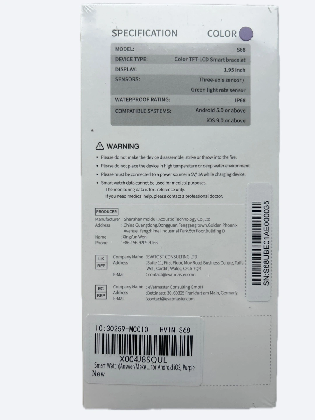 Brand new smart watch. Features fitness tracking, call functions, and more. 1.95 inch colour display. Compatible with Android 5.0 or above and iOS 9.0 or above. IP68 waterproof rating.
