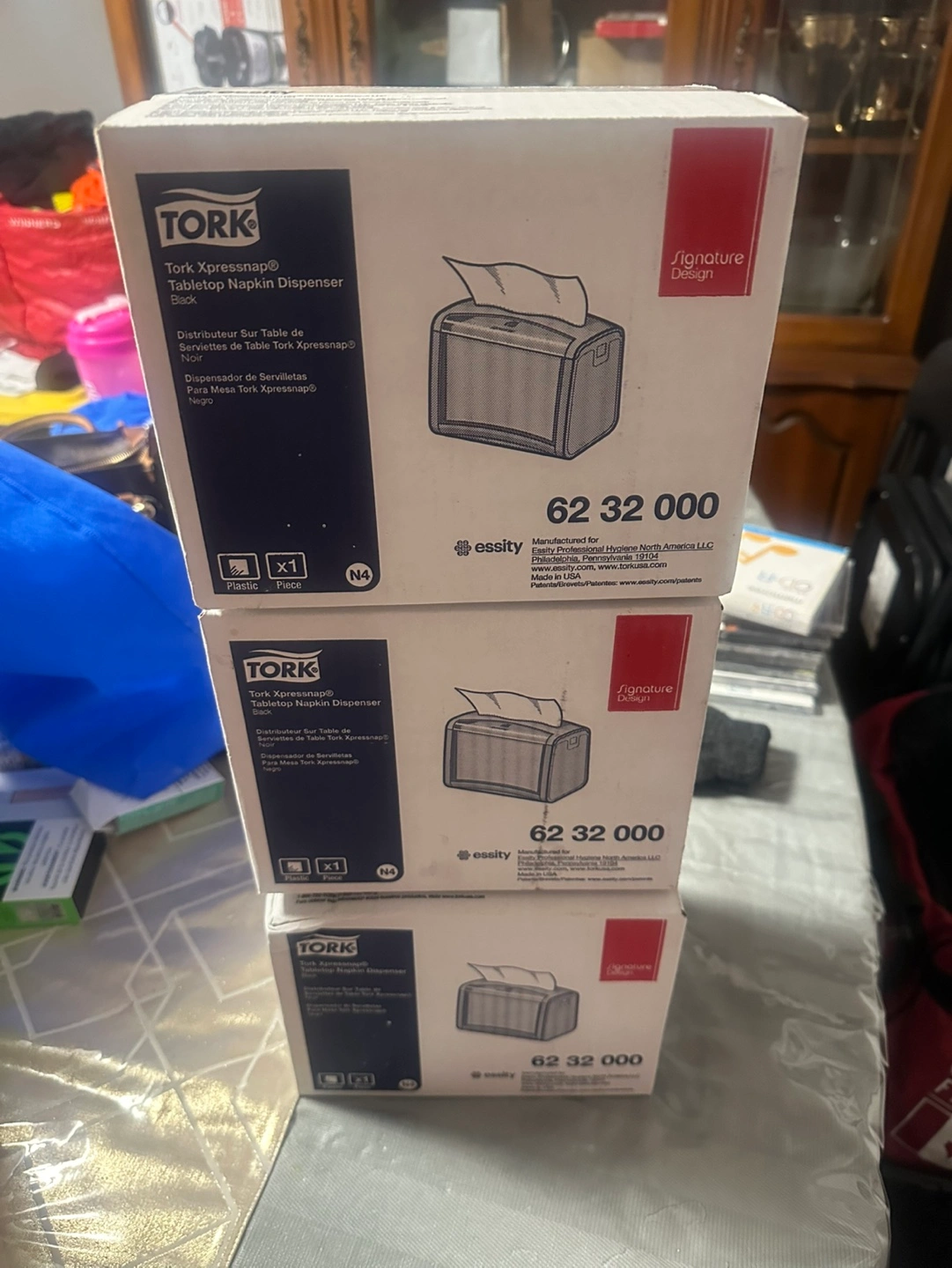 Three new Tork Xpressnap tabletop napkin dispensers. Black colour. Signature design. Plastic. One piece.