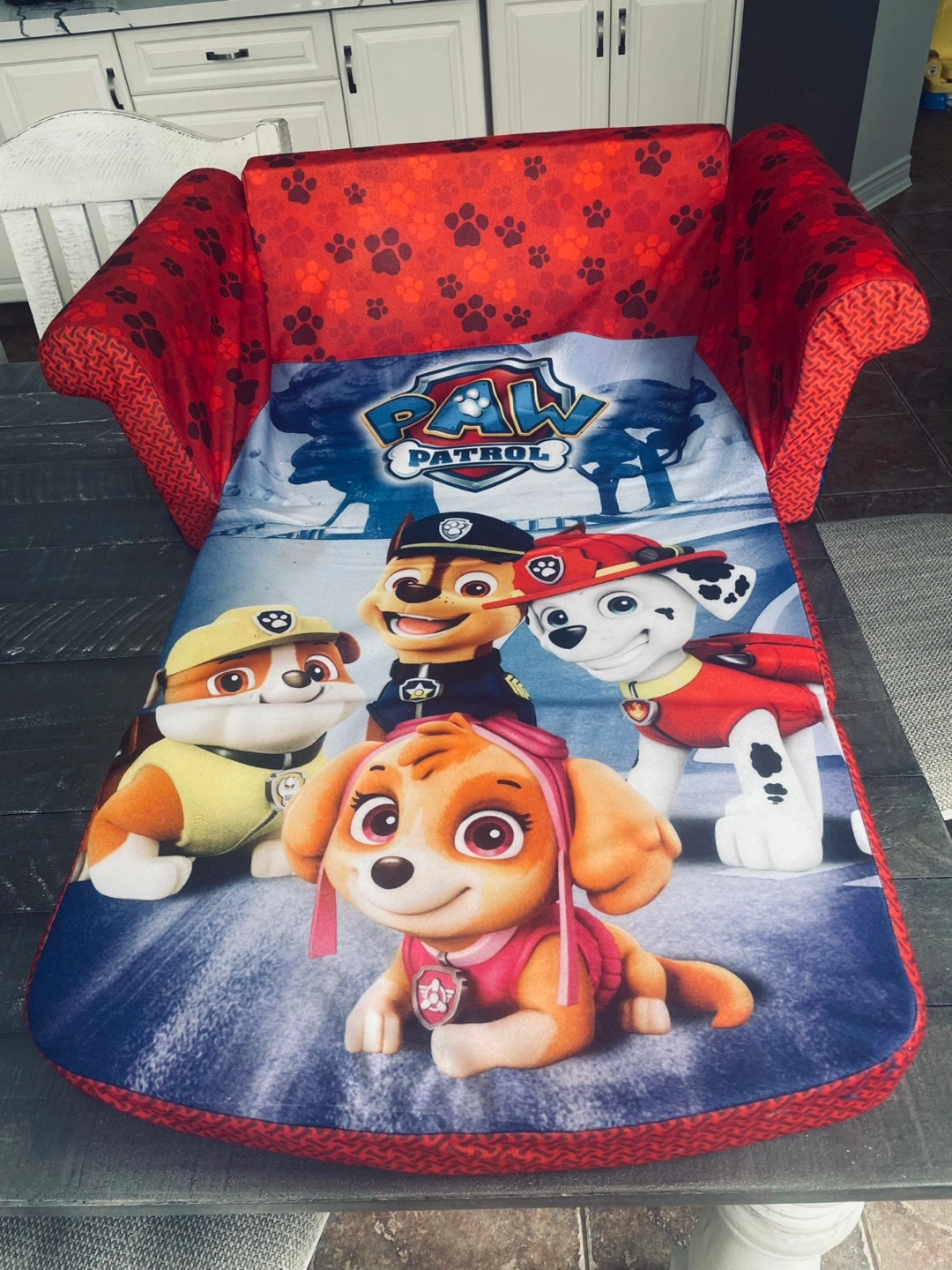 50Adorable Paw Patrol-themed kids sofa. Converts to a sleeper. Red fabric with Paw Patrol characters. Perfect for a child's room or play area.