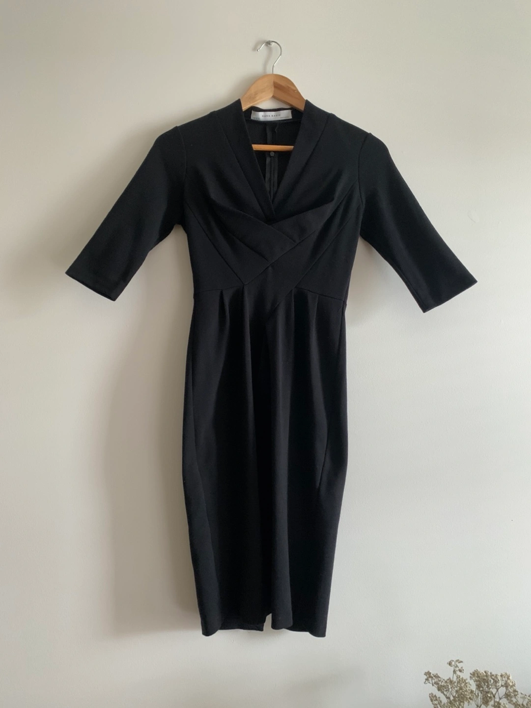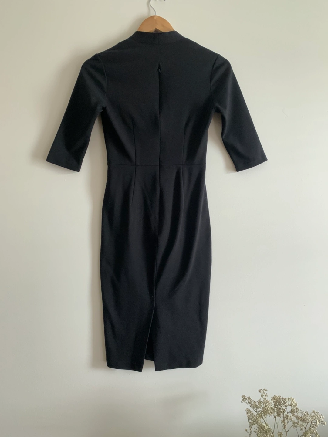 Black midi dress. Three-quarter sleeves. V-neck. Unique design at the chest area which enhances the bust.
