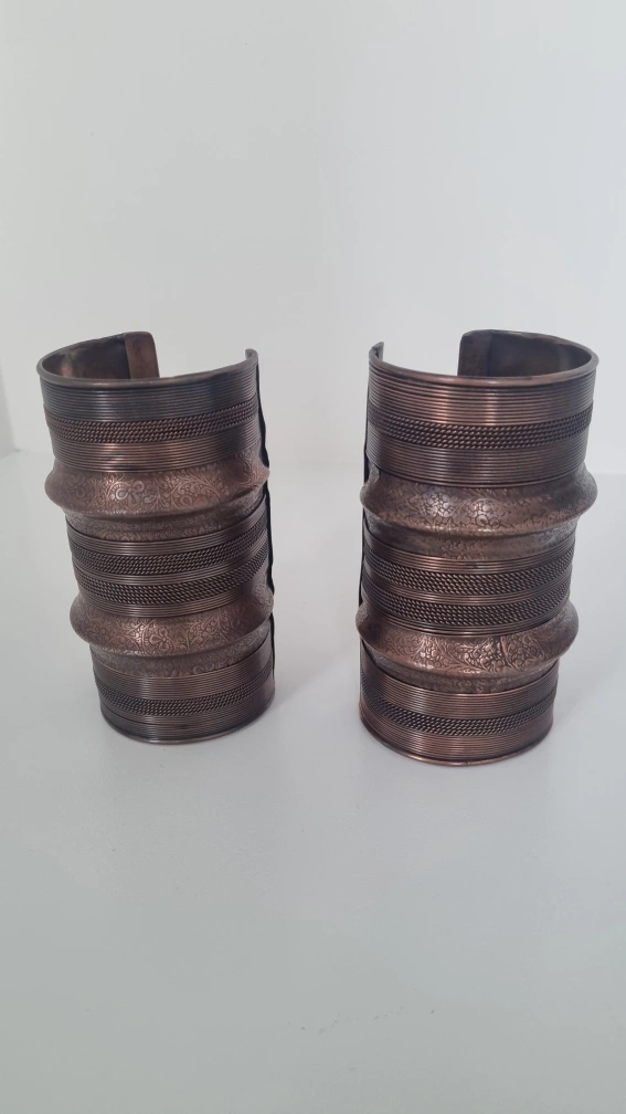 Unique pair of antique-looking copper bracelets. Intricate detailing. Wide cuffs. Open design. Excellent for layering or statement wear.