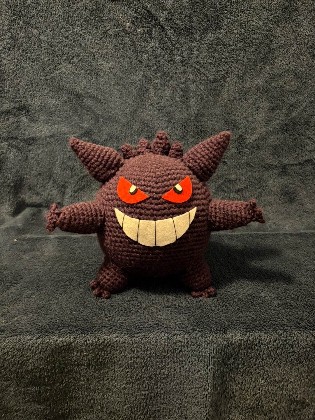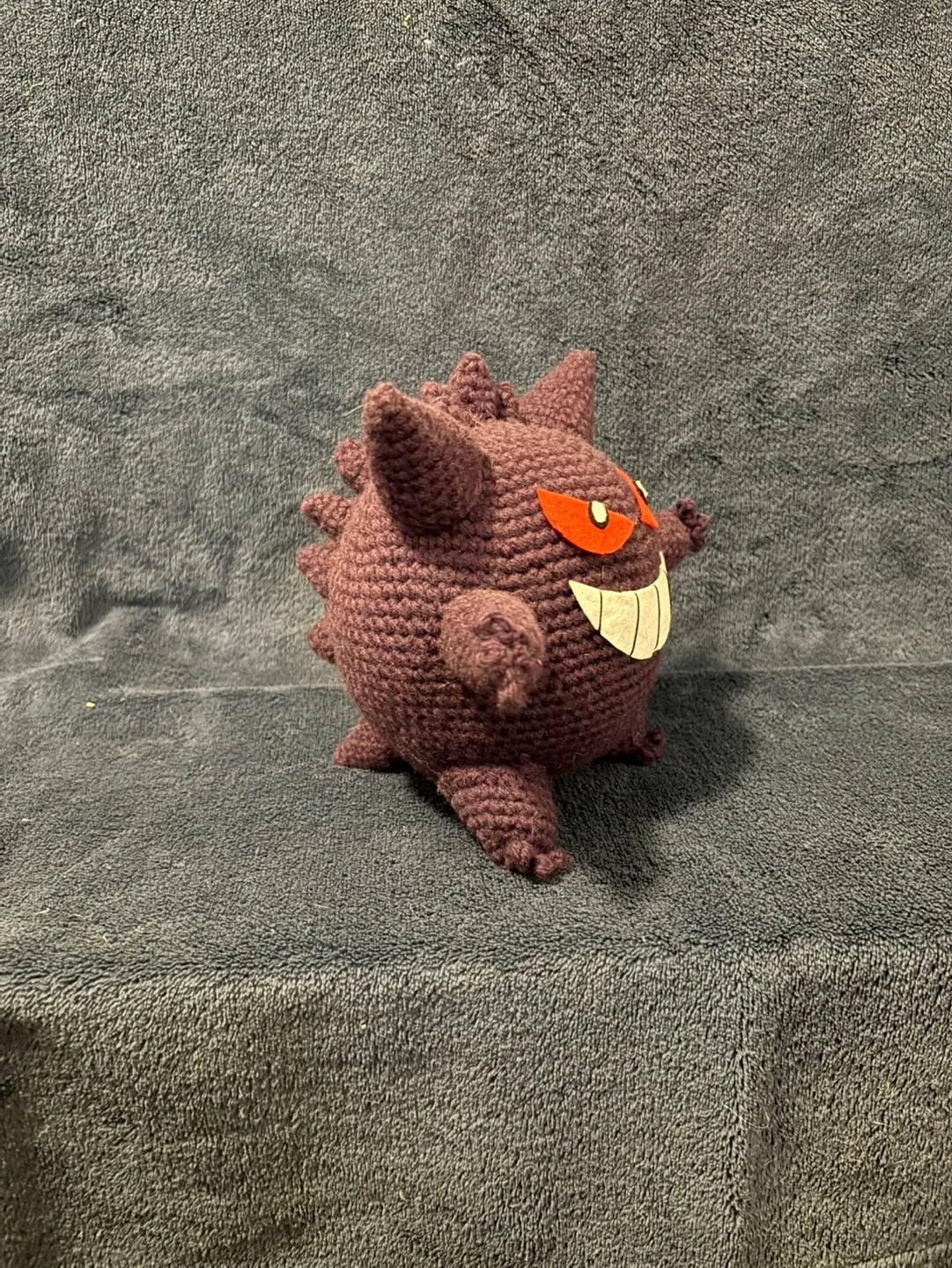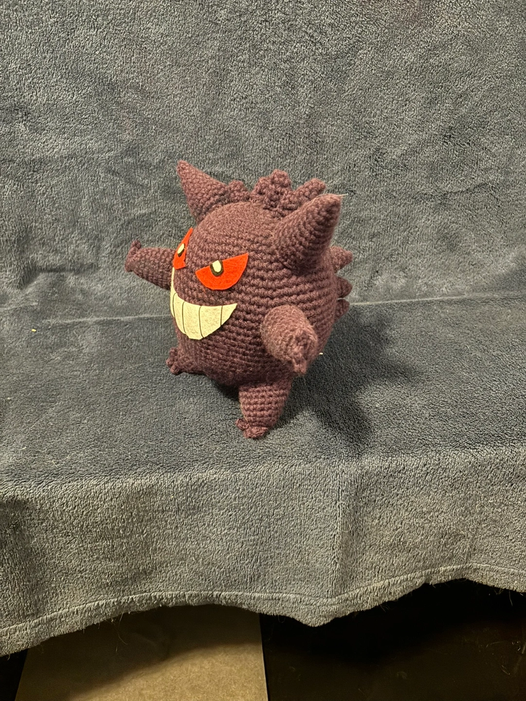 Adorable crocheted Gengar plush. Great gift for Pokémon fans. Dark purple yarn. Red felt eyes. Approximately 6 inches tall. Unique handmade item.