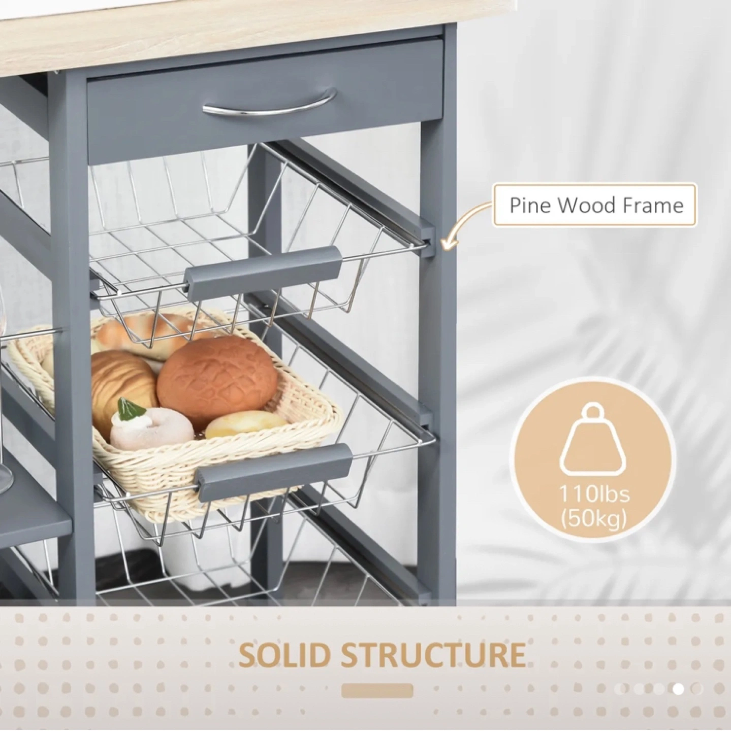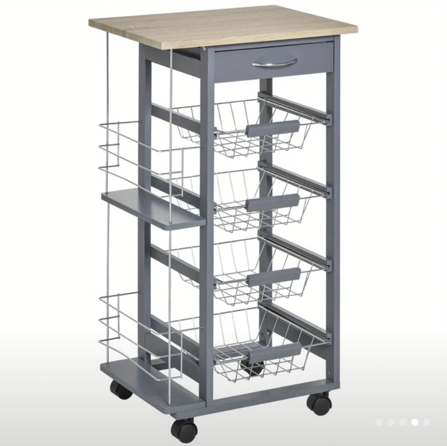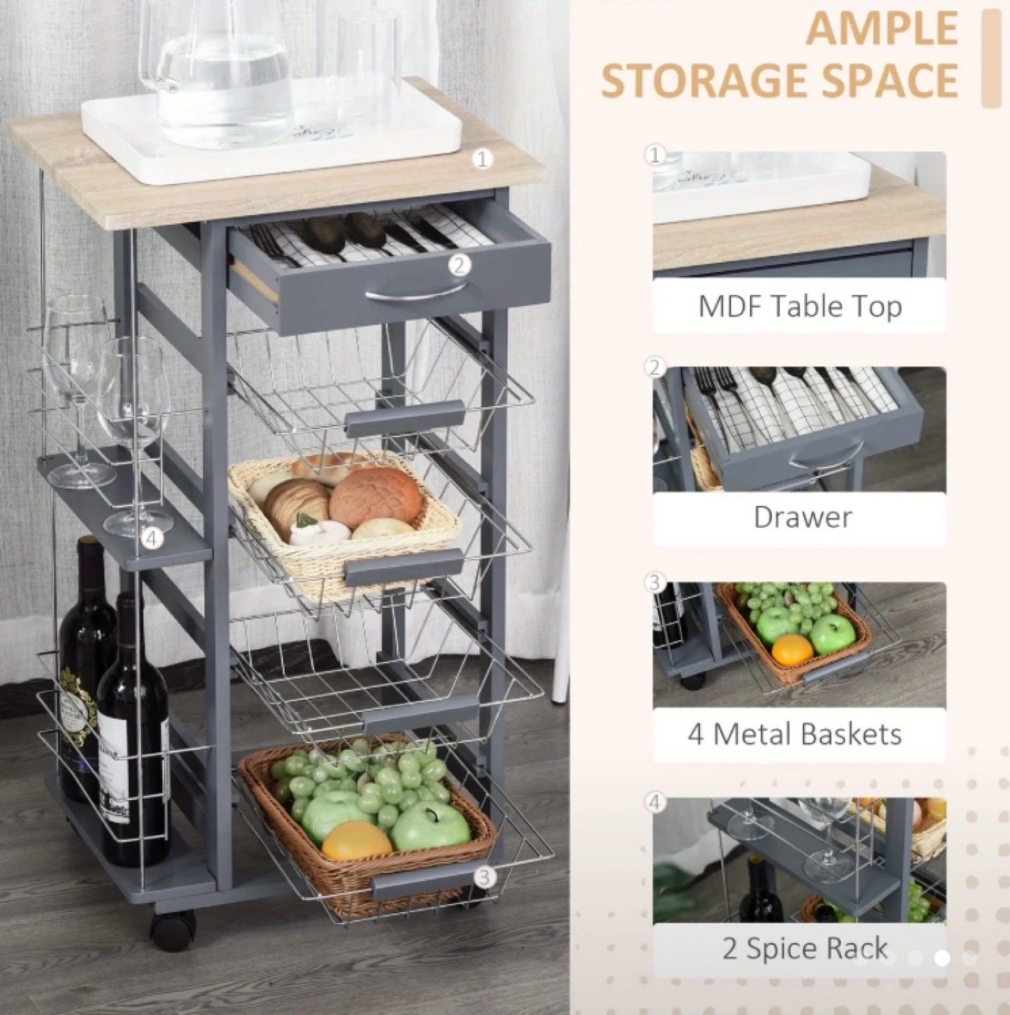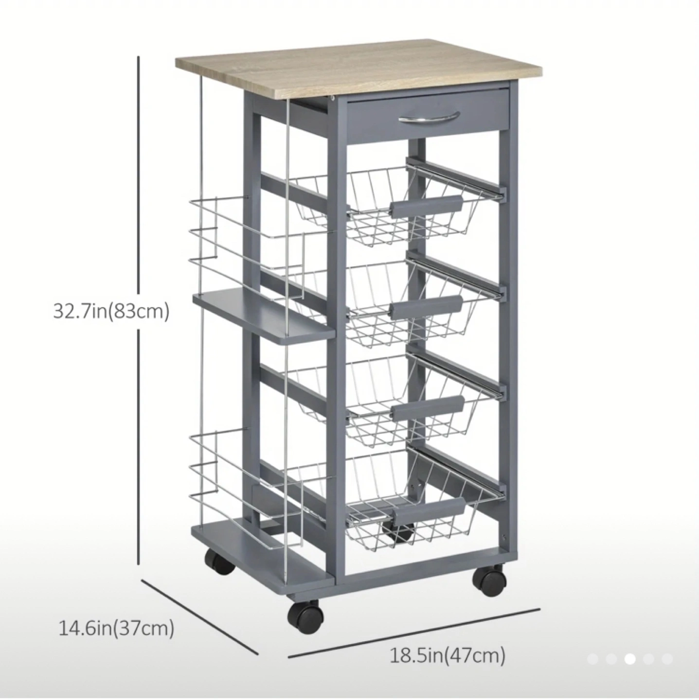 Grey kitchen utility storage rolling cart. Features 4 metal baskets, 1 drawer, 2 side racks and a wooden counter top. Ample storage space.