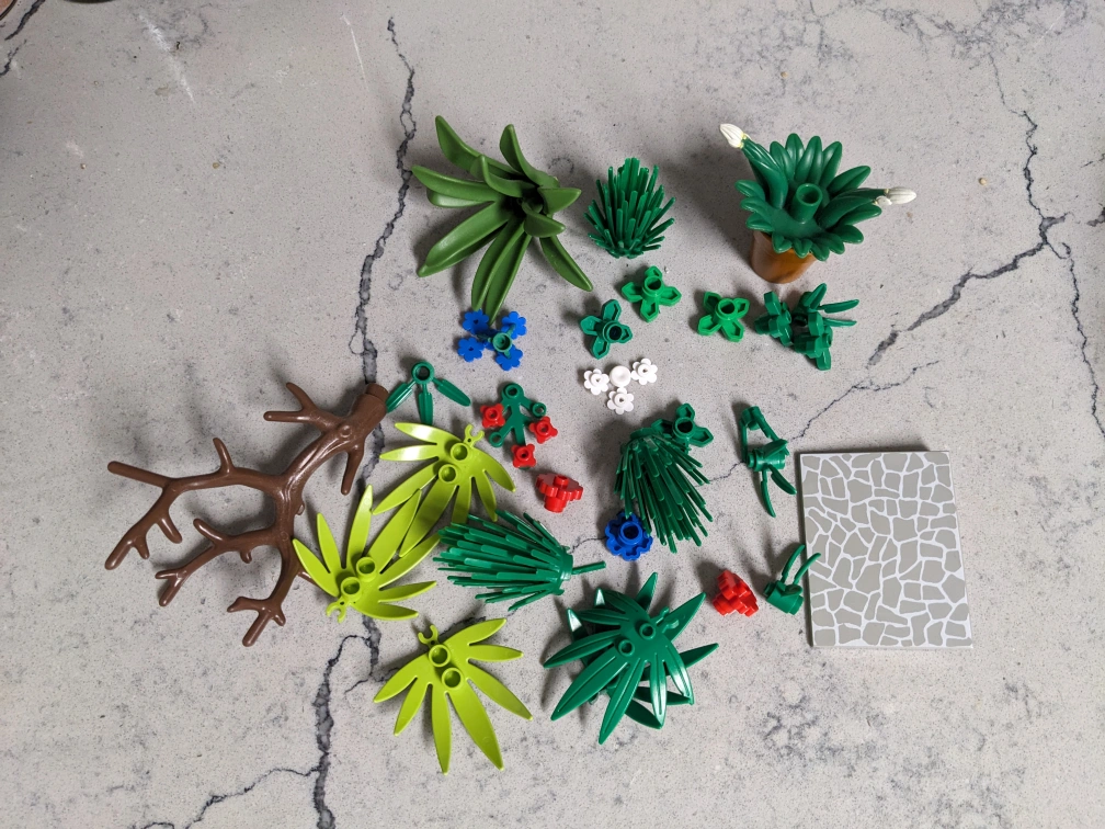 Collection of LEGO plants, shrubs, flowers, and a stone tile.