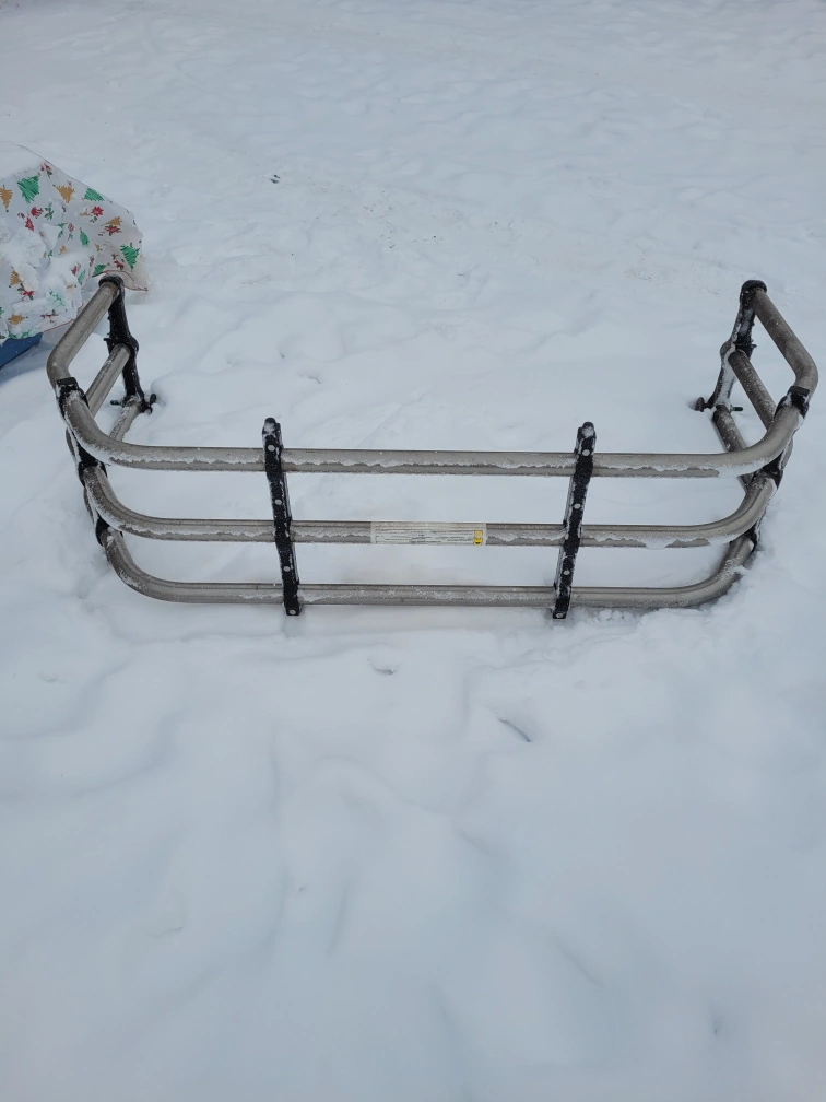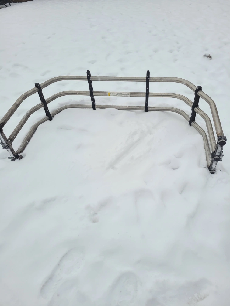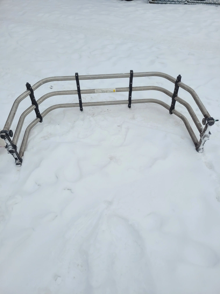 Show allStainless steel truck bed header. Three bars. Curved to fit truck bed. Black end caps. Used condition. from a Ford not sure of year but can purchase part to make fit any brand of truck