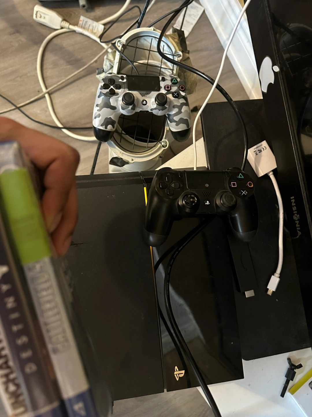 PlayStation 4 console, two controllers, and a couple of games. One controller is camouflage. Bundle includes cables and accessories. Pre-owned.