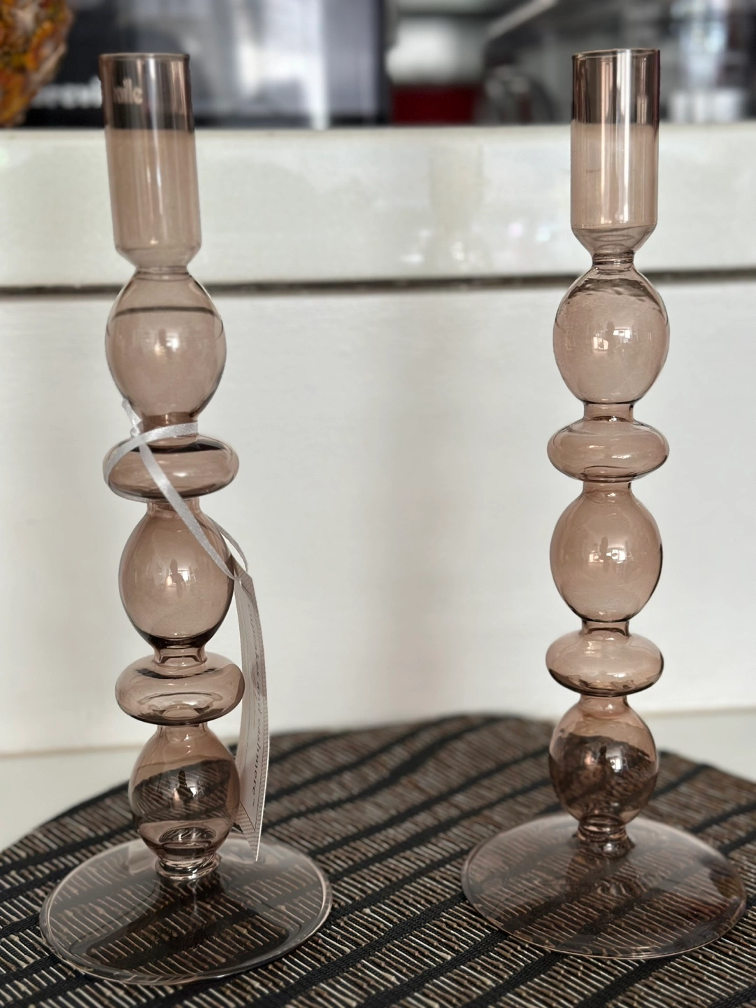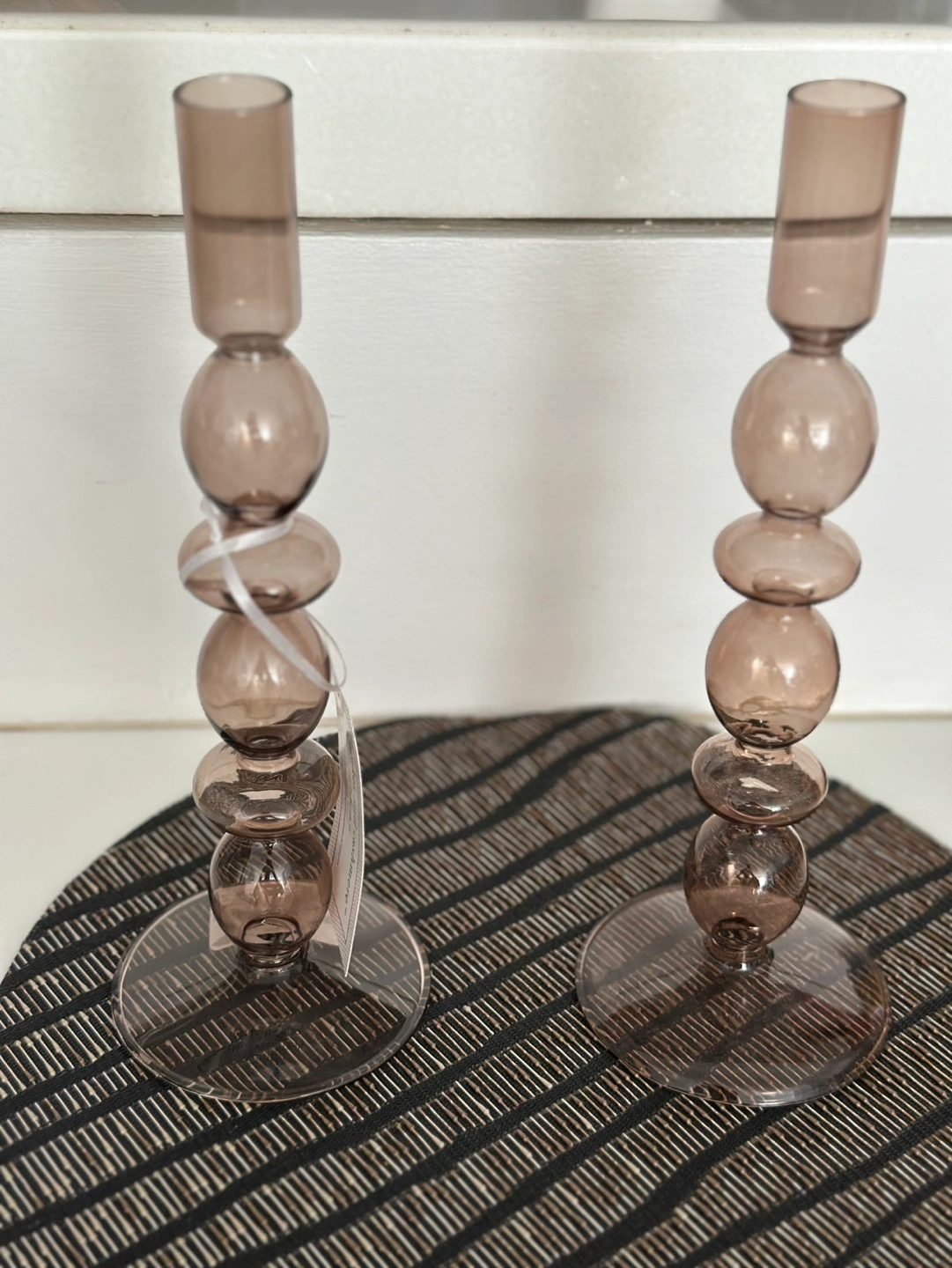 brown glass candle holders. Unique beaded design. Perfect for adding a touch of elegance to your home decor. New, never used.