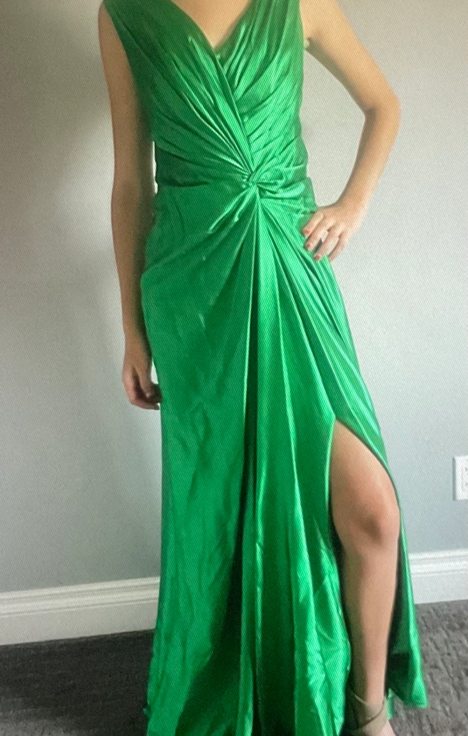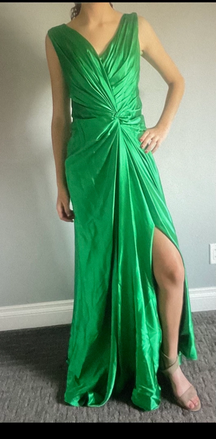 Elegant floor-length gown. Features a V-neckline, flattering draped bodice, and a high leg slit. Perfect for a special occasion. Beautiful rich colour. Size small