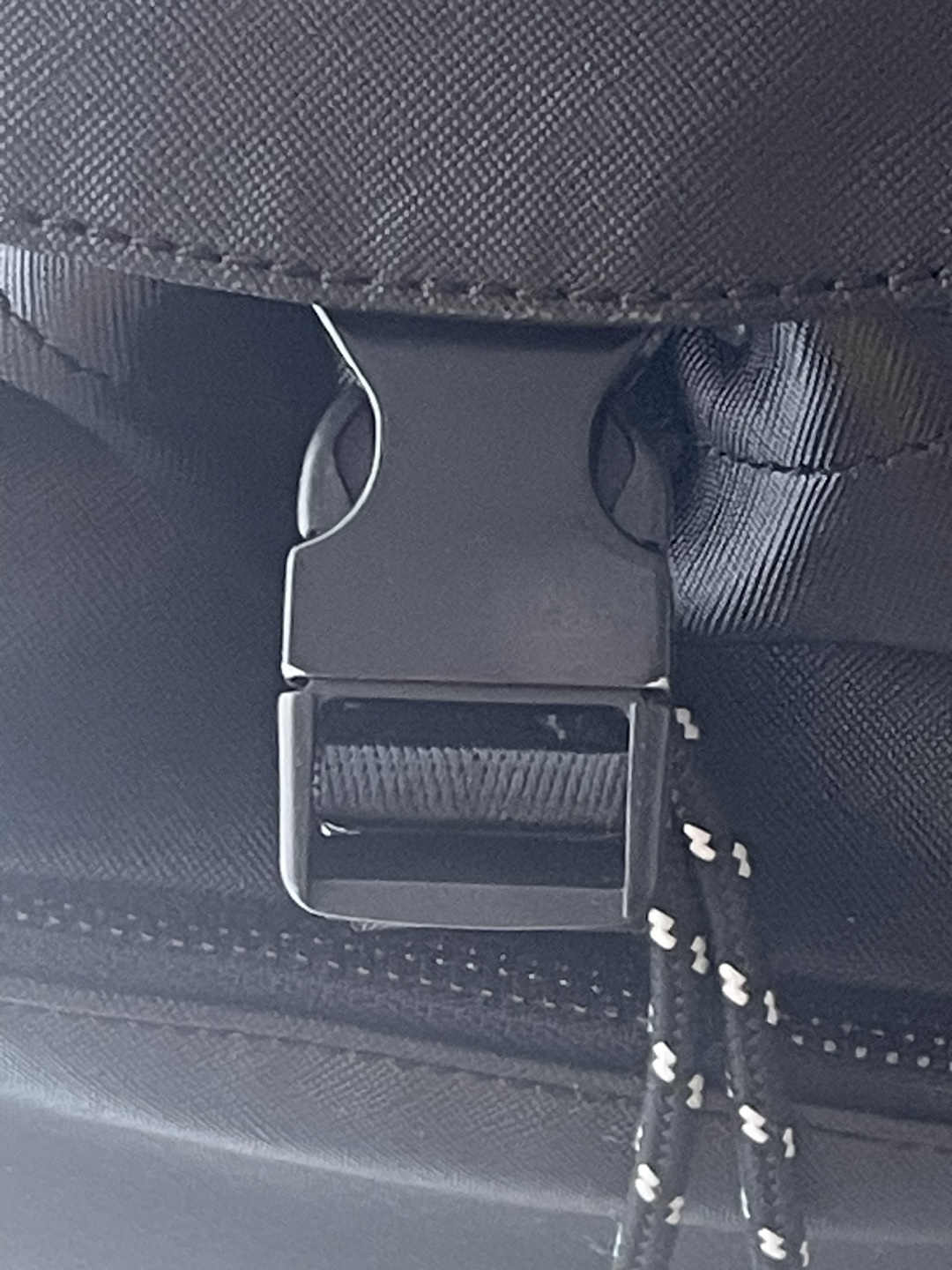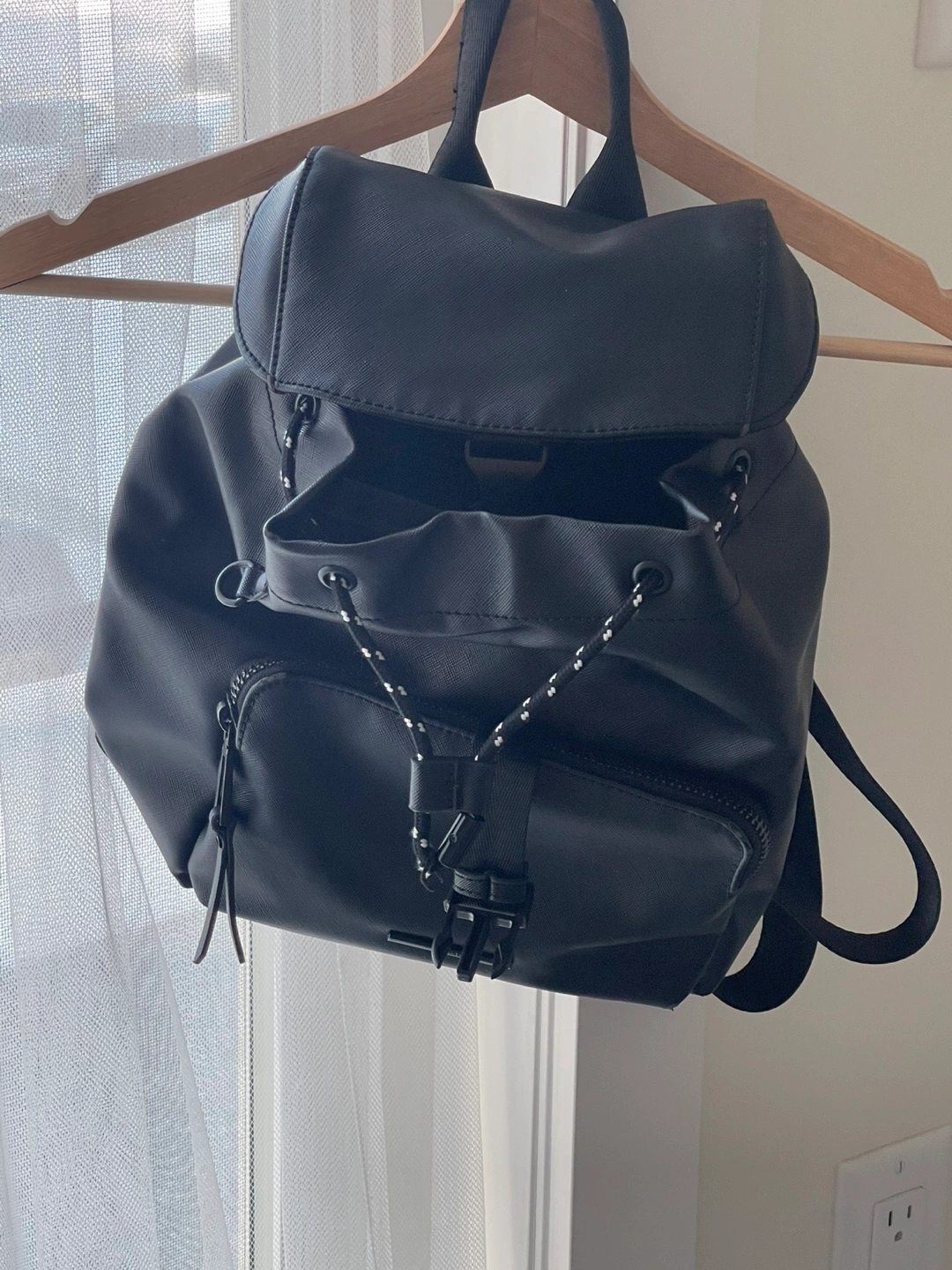Small black backpack. Drawstring closure and buckle detail. Zippered front pocket. Adjustable straps.