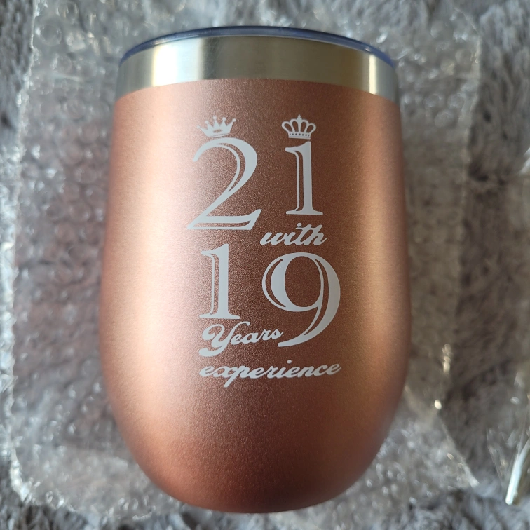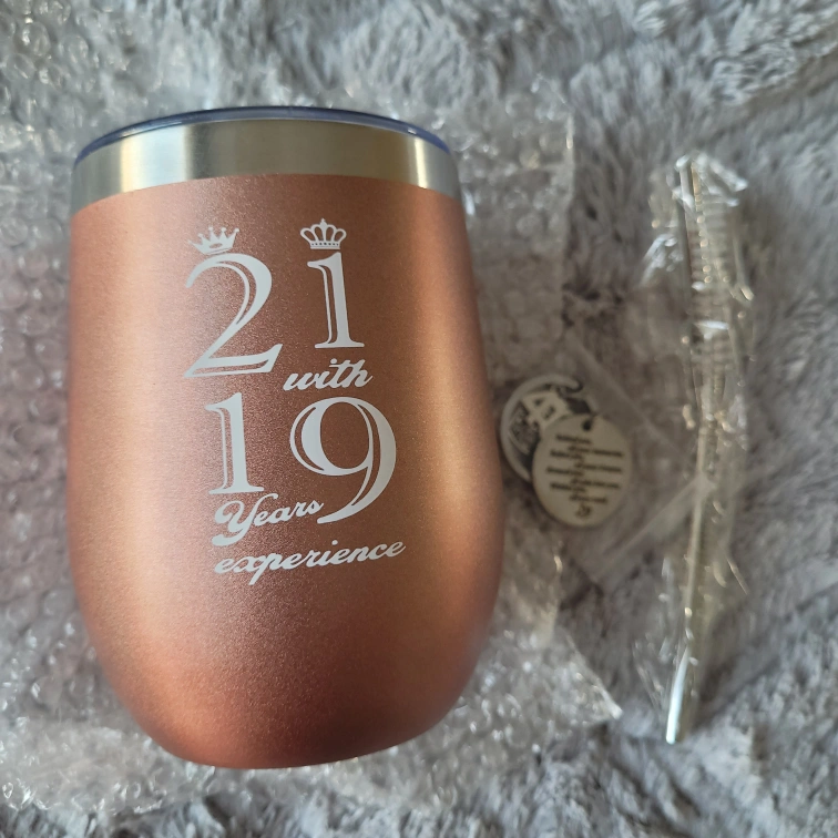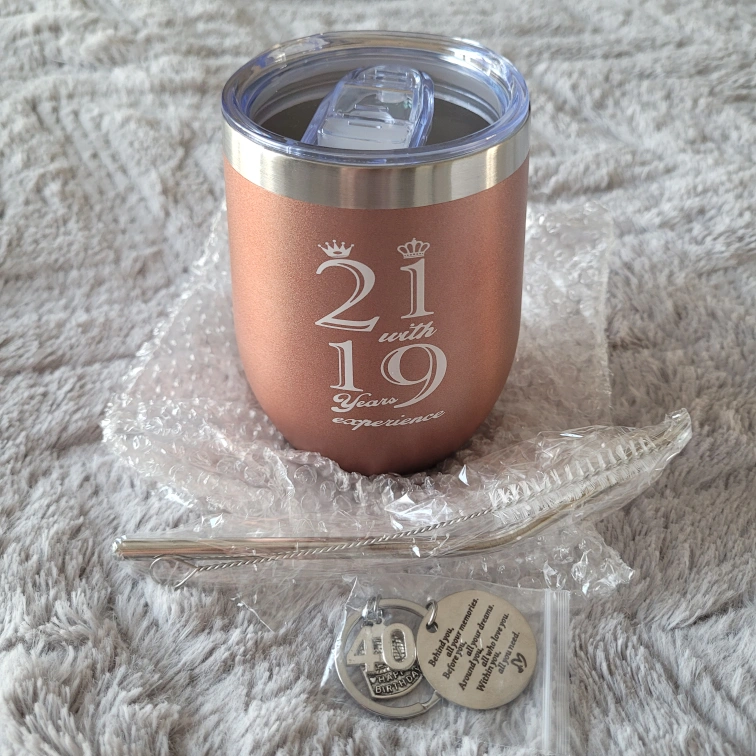 Brand new, never used. Rose gold stemless wine tumbler features "21 with 19 years experience". Includes matching 40th birthday keychain and straw with straw cleaner. New, in box.