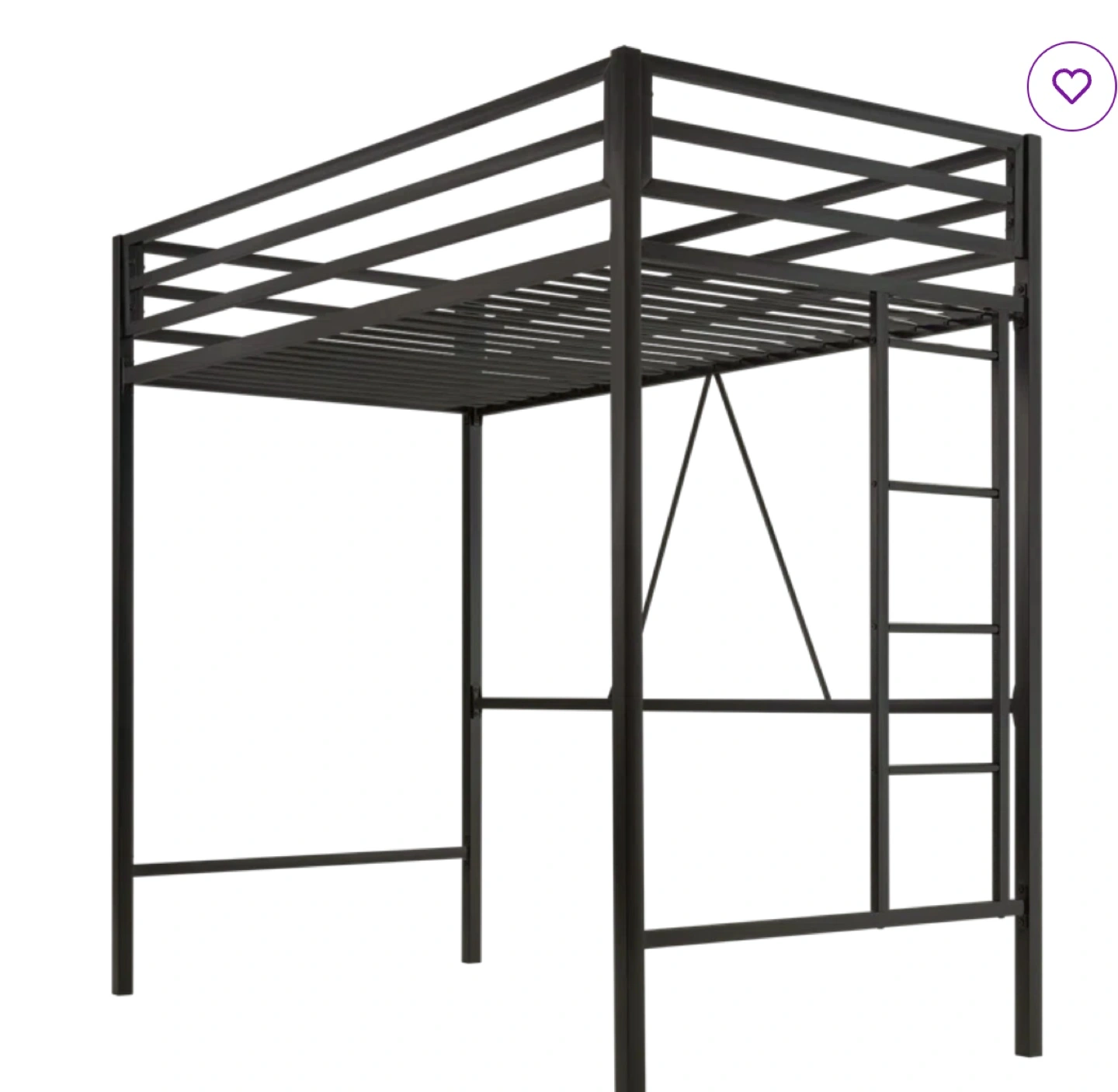 Sleek metal loft bed frame. Includes integrated ladder. Sturdy construction. Minimalist design. Perfect for small spaces. Wayfair Braga, twin platform loft bed by Isabella and Max Used and in very good condition. Comes with mattress. 71.9H x 41.3W x 77.6L Bottom of top bunk to floor 58.1